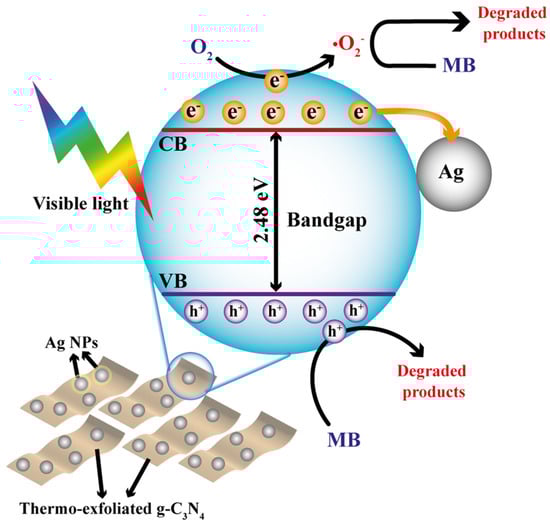 Based on the above analysis, a schematic diagram of a possible photocatalytic mechanism for a 5Ag/g-C3N4 photocatalyst is displayed in Figure 7. It is known that the photocatalytic activity of a material is influenced by its textural, structural, optical, and electronic properties. In our work, the enhanced performance of photocatalyst degradation was mainly attributed to the synergistic effect of thermoexfoliated g-C3N4 with a superior surface area and the presence of Ag nanoparticles over g-C3N4 sheets. The obtained exfoliated g-C3N4 nanosheets present superior textural characteristics (surface area of 143.8 m2 g−1), which could provide more active sites for redox reactions and better photoactivity. Moreover, the migration distance of charges from the bulk to the surface was significantly decreased in g-C3N4 after exfoliation, resulting in a decreased recombination process during the migration of the photogenerated charges to the surface. Moreover, the photocatalytic activity of the material containing 5 wt.% of Ag exhibits the primary role of silver nanoparticles, acting as electron traps to decrease charge recombination. However, new charge-recombination centers are generated at higher Ag contents than the optimal amount, resulting in a decrease in photoactivity []. This result is supported by PL analysis, where exfoliated g-C3N4 samples showed a significant reduction in the intensity band of PL compared to bulk g-C3N4. This last observation is even more evident with the incorporation of Ag. This effect can be explained by the good dispersion of the Ag nanoparticles in g-C3N4, which assisted in improving the number of photocatalytic sites. However, introducing large concentrations of metal to a photocatalyst can cause an agglomeration of particles and a loss of active surface.