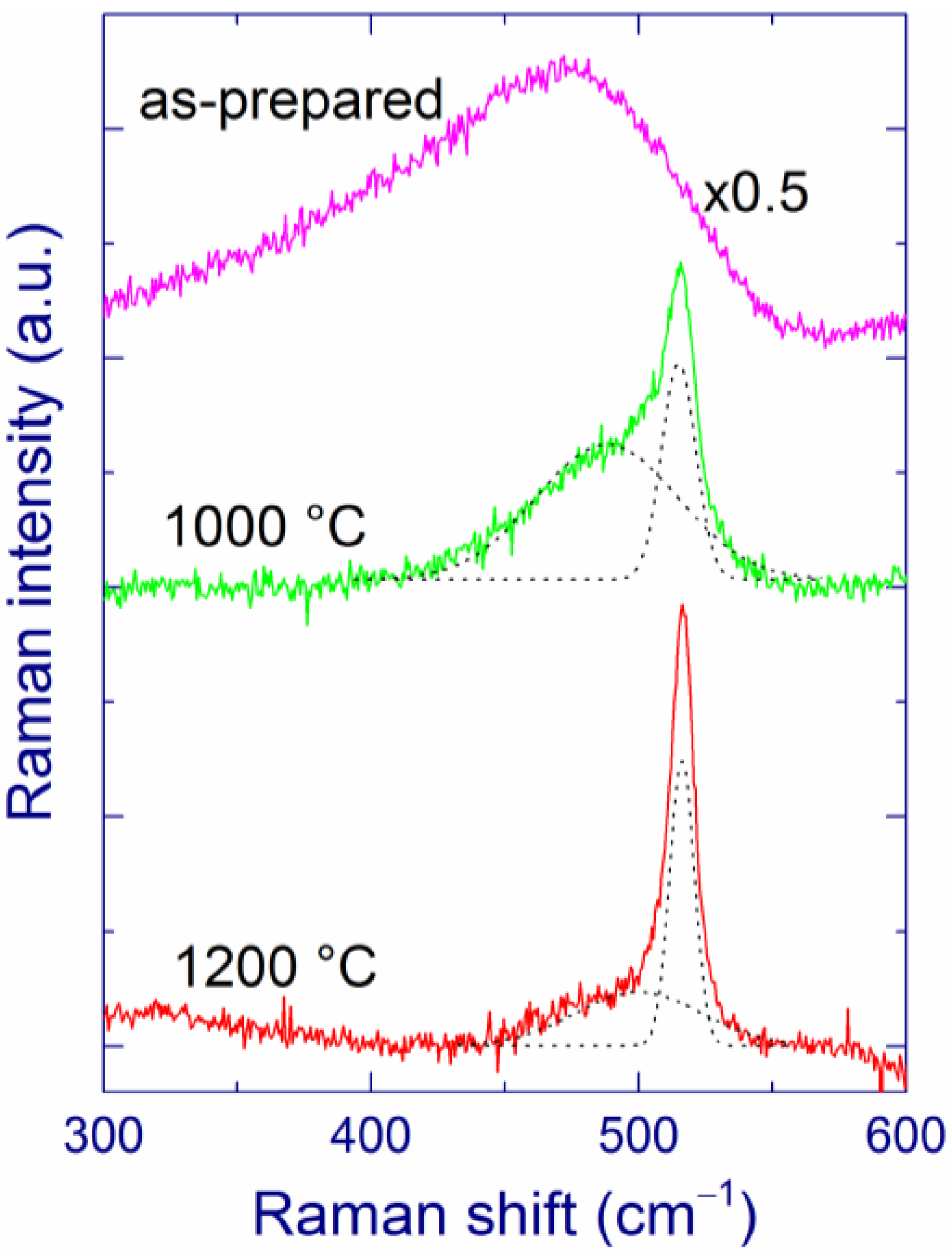 As the annealing temperature increases, the low-frequency shoulder in the Raman spectra responsible for disordered Si and/or small Si clusters gradually decreases (Figure 1). However, even after annealing at 1200 °C, the low-frequency component of the Raman band does not disappear and its area is comparable to that of the high-frequency component. As a possibility, small Si grains in a SiO2 matrix may be disordered even after annealing at this temperature whereas larger Si grains are crystallized.