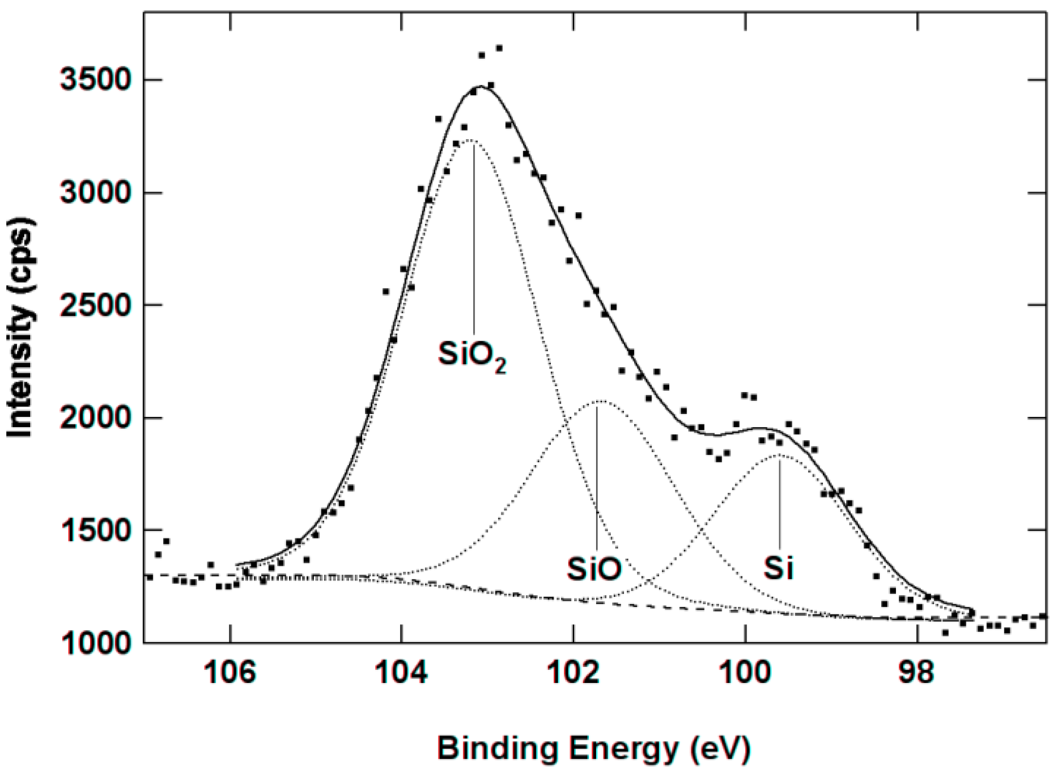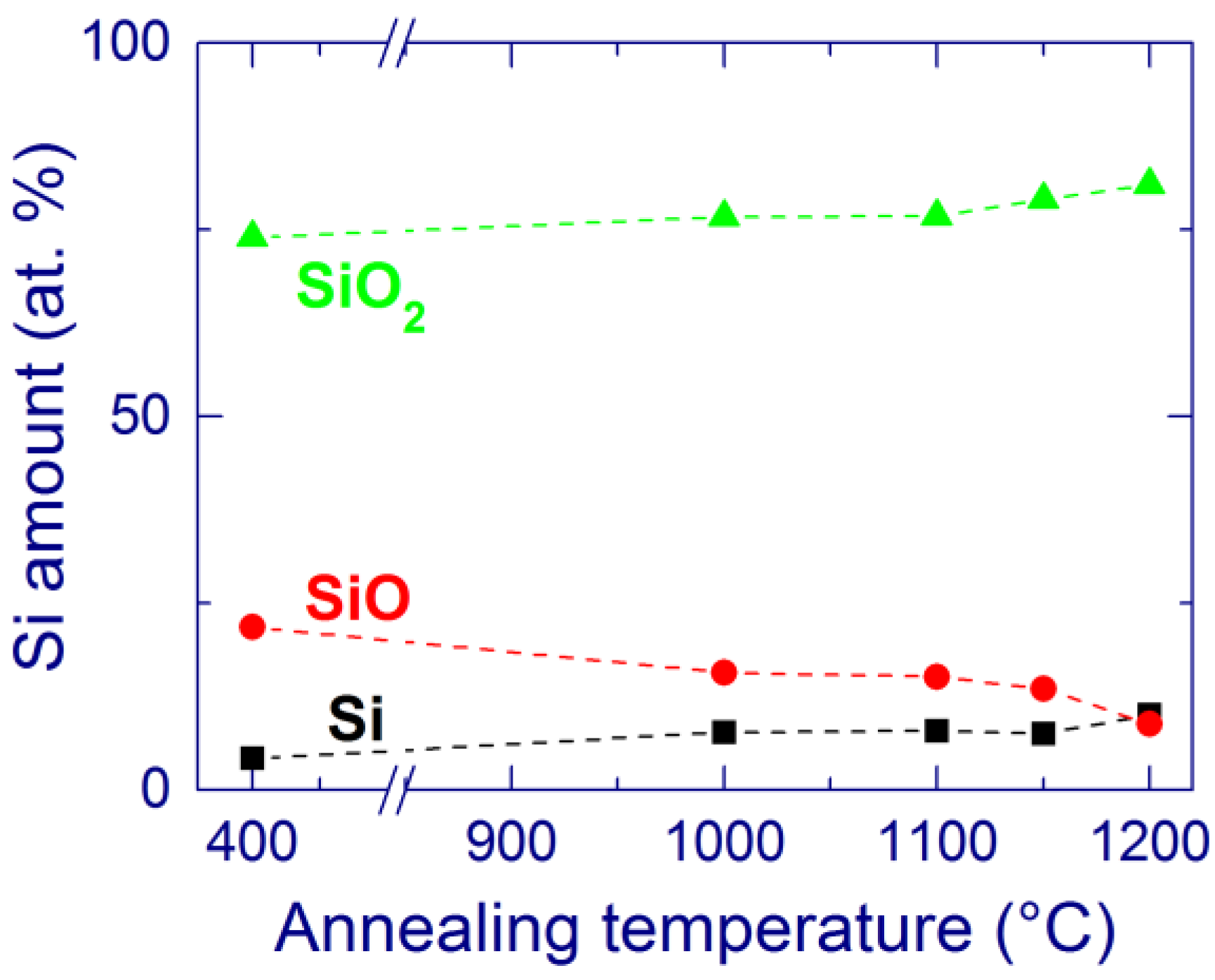 X-ray photoelectron spectroscopy (XPS) confirms that the structural reorganization is not complete after furnace annealing (Figure 2). The Si–SiO2 phase separation increases with the annealing temperature, which is evidenced by the increasing amount of elemental Si and SiO2 and the decreasing amount of SiO. However, a large proportion of suboxides (10–15 at. % for x = 1.7) is still detected after annealing at 1200 °C [116]. This result indicates incomplete Si–SiO2 phase separation in these materials.