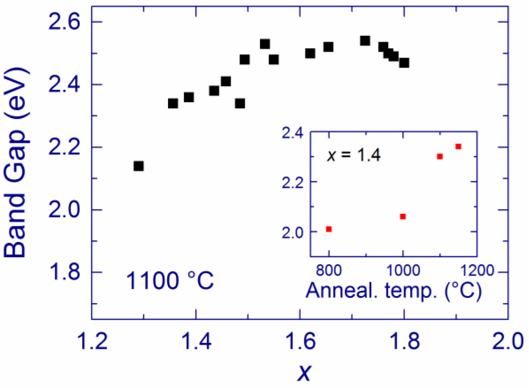 Band gap of SiOx films annealed at 1100 °C as a function of x. The inset shows the band gap of a SiO1.4 film as a function of the annealing temperature. Reproduced with permission from [116]. Copyright 2012, AIP Publishing LLC.