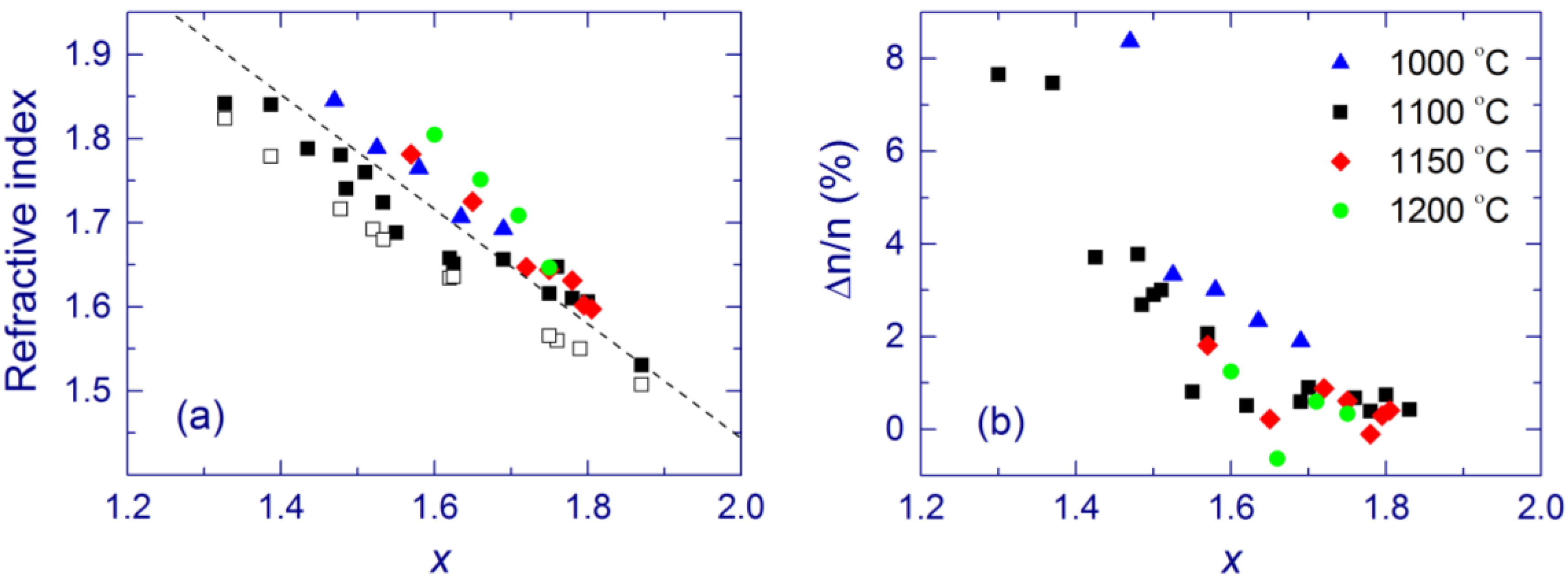 (a) TE refractive index and (b) birefringence of SiOx films annealed at 1000 °C (triangles), 1100 °C (squares), 1150 °C (diamonds), and 1200 °C (circles) as a function of x. The open squares show the refractive index obtained using the effective medium approximation and the XPS results for annealing at 1100 °C. The dashed line is a guide for the eye. (a) is reproduced with permission from [116]. Copyright 2012, AIP Publishing LLC.