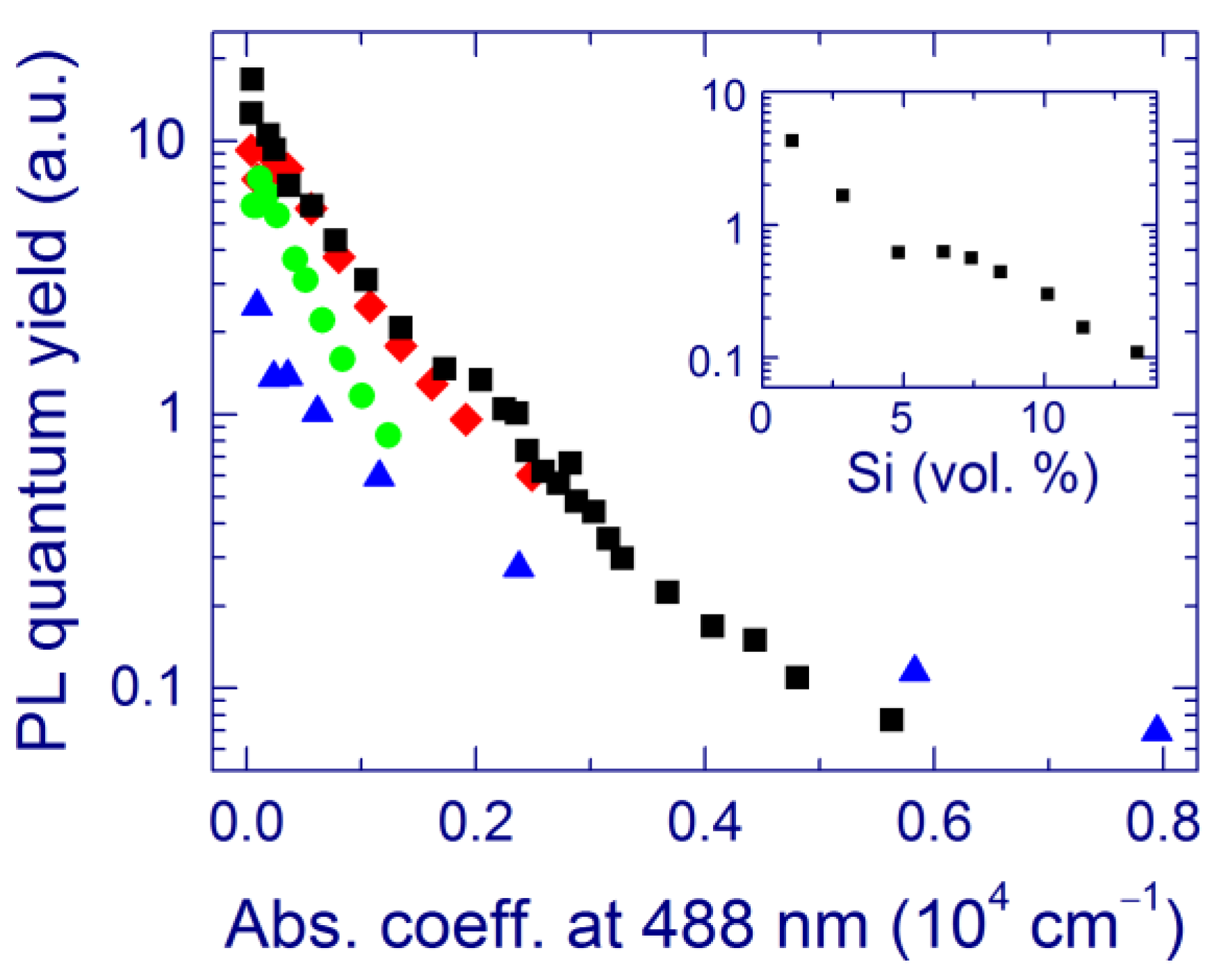 Relative PL quantum yield for SiOx films prepared by MBD for annealing at 1000 °C (triangles), 1100 °C (squares), 1150 °C (diamonds), and 1200 °C (circles) as a function of the absorption coefficient at 488 nm. The inset shows the relative PL quantum yield as a function of the amount of elemental Si for annealing at 1100 °C. Reproduced with permission from [116]. Copyright 2012, AIP Publishing LLC.