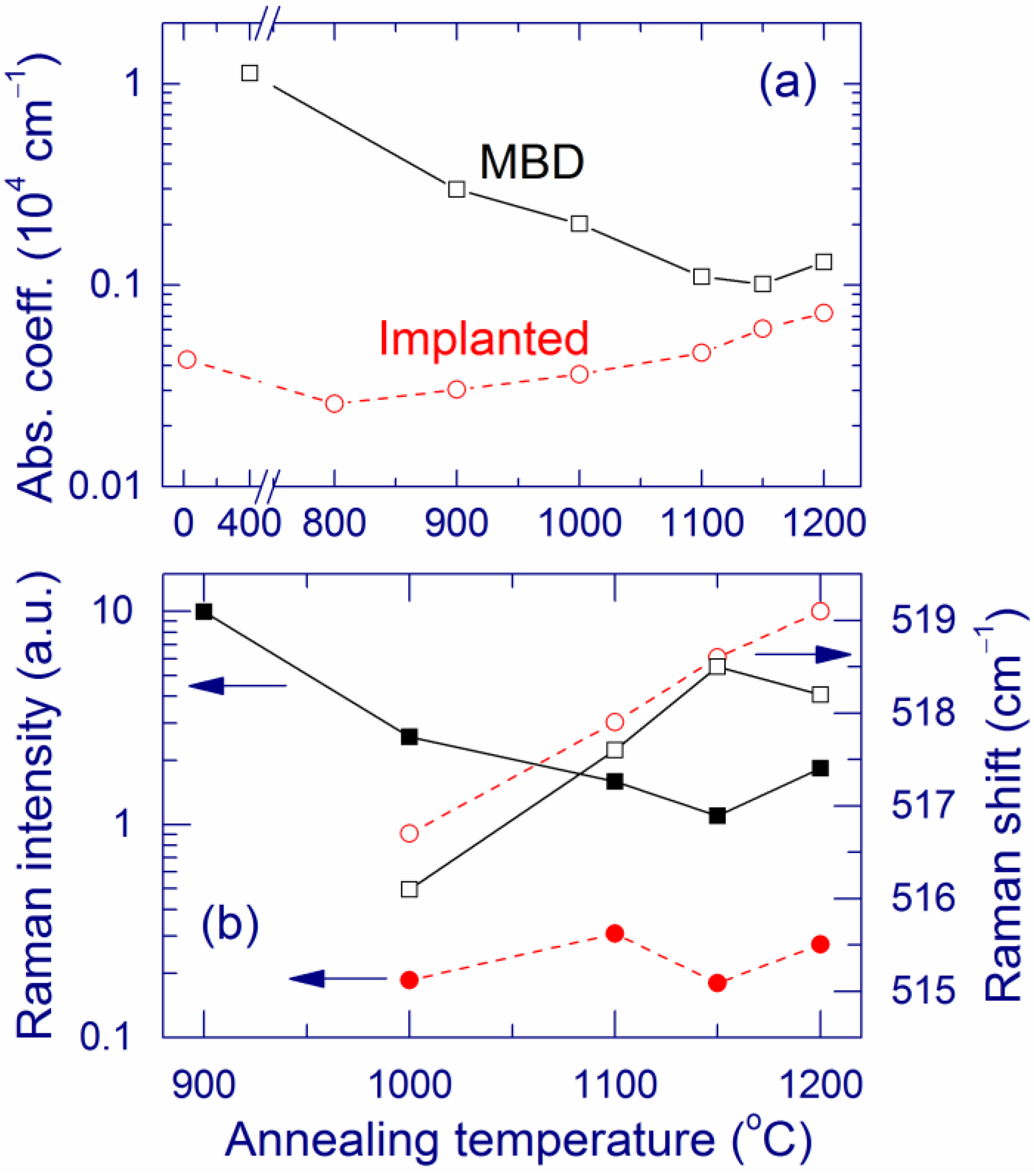 (a) Absorption coefficient at 488 nm for the MBD (squares) and implanted (circles) samples and (b) Normalized intensity (solid symbols) and position of the maximum (open symbols) of the Raman bands as a function of the annealing temperature. The Raman intensity is normalized by the effective film thickness (see Section 3.2). Reproduced with permission from [118]. Copyright Wiley-VCH Verlag GmbH & Co. KGaA.