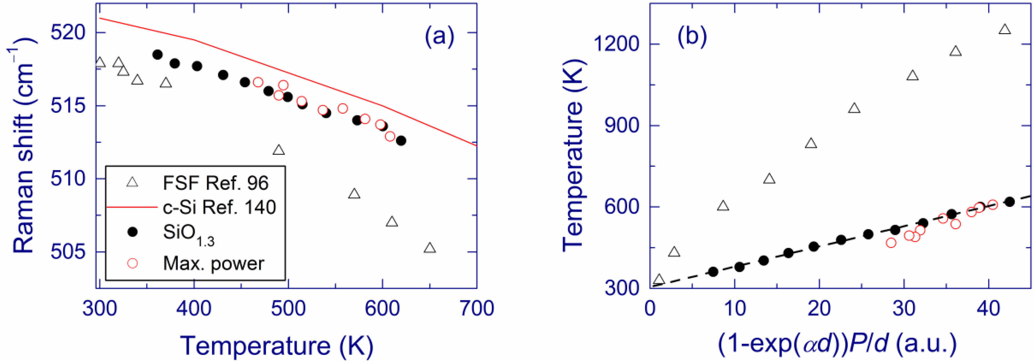 Figure 10b shows the laser-induced temperature for a free-standing SiO1.7 film and SiOx films (1.3 ≤ x < 1.5) on silica substrates as a function of the laser power absorbed by a unit volume, which is proportional to , where P is the laser power, α is the absorption coefficient, and d is the film thickness [95]. The linear fit of the temperature versus the absorbed power yields the room temperature at zero power, which verifies the results. For the same absorbed power, the laser-induced temperature is much higher in the free-standing films compared to the films on substrates, which is due to the thermal flow to the substrate in the latter case.