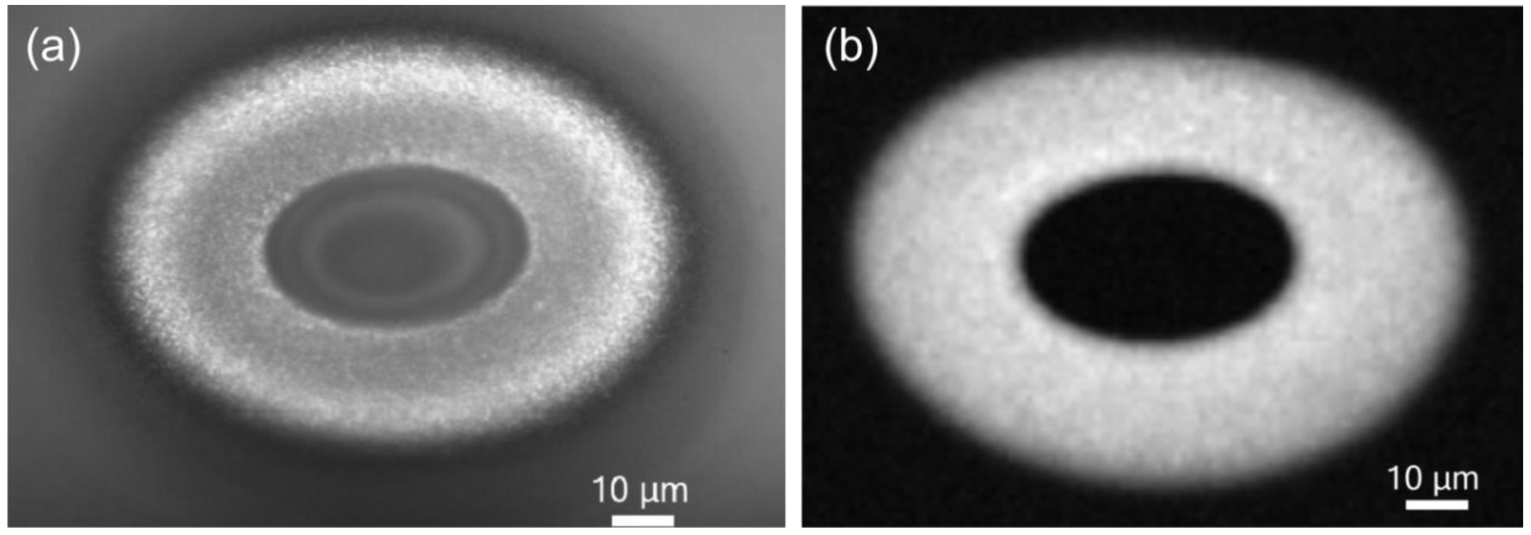(a) Optical microscope photograph and (b) Raman map of the Si-nc band. A 2-μm-thick free-standing SiOx film (x ~ 1.7–1.8) is exposed to 488-nm light (~110 mW) through a lens (focal length of 150 mm). In the optical photograph, the sample is illuminated through the objective. The oval shape is due to a non-perpendicular direction of the annealing laser beam. Brighter regions in the Raman map correspond to stronger Raman signals. The Raman signal is integrated in the 510–540 cm–1 spectral range. Reproduced with permission from [140]. Copyright 2010, AIP Publishing LLC.