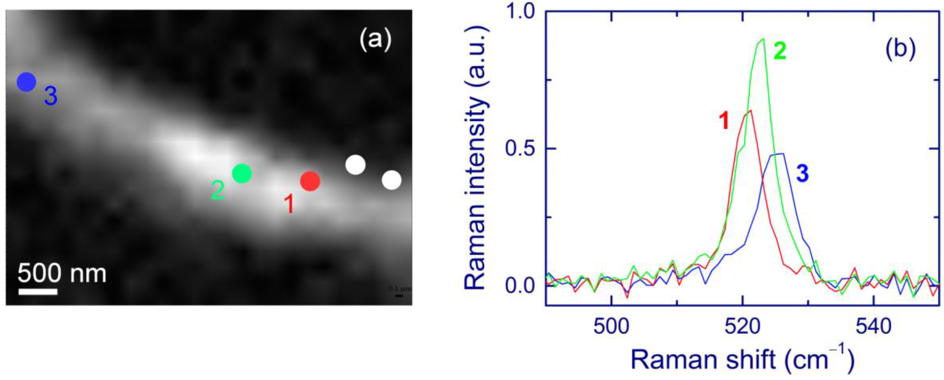 Raman measurements confirm the proposed eruption model. The surface Si nanocrystal shown in the TEM images in Figure 13 is located in position 1 in Figure 14a. The Raman shift obtained in this position is ~520 cm–1 (spectrum 1, Figure 14b), which indicates a low stress. It is reasonable that Si eruption can relax stress in the vicinity of surface Si-nc. The compressive stress is partially relaxed at a distance of about 1 µm from the surface feature (spectrum 2). The Raman spectrum measured at position 3, which is far away from the surface feature, shows a higher compressive stress (spectrum 3 in Figure 14b).