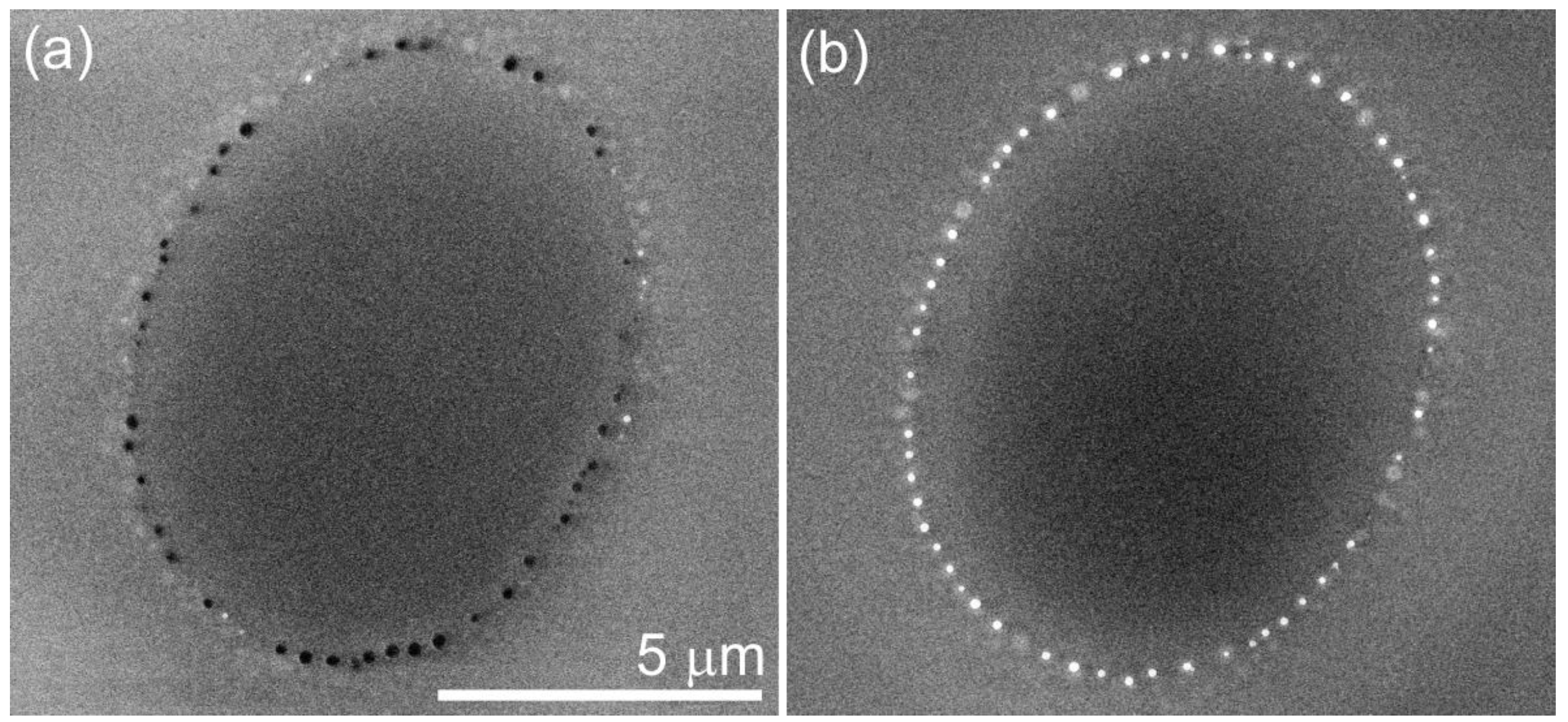 In the ring around the central region, the EFTEM, BF-STEM, and TEM images evidence large Si-nc embedded in amorphous SiO2 (Figure 13) [140,141,142]. The maximum Si-nc diameters (~200 nm) for the 0.5-μm-thick Si/SiO2 SLs [141] are on average two times larger than those detected for the 0.5-μm-thick free-standing SiOx films (x ~ 1.7–1.8) [140]. This difference is reasonably explained by a larger Si content in Si/SiO2 SLs (x ~ 0.7 from the deposition conditions) compared to the SiOx films (x ~ 1.7–1.8). The crystallinity of the large Si clusters in the ring region is confirmed by selected-area diffraction measurements (for 0.5-μm-thick SiOx film) and Raman spectroscopy. The Raman band is quite narrow and does not have a shoulder at 450–500 cm–1, indicating the absence of amorphous phase and therefore suggesting efficient Si crystallization (see Figure 12a). The EELS spectra show the presence of the Si and SiO2 phases. In accord, the FTIR spectra correspond to stoichiometric SiO2 perturbed by the Si–SiO2 interface. The Raman bands from the ring region is stronger by about 2–3 orders of magnitude compared to the pristine film, which is explained by the resonance size effect for the large Si-nc [144]. The Raman bands from Si-nc in the ring region are typically shifted up to ~530 cm–1 (from the value of 521 cm–1 for crystalline Si) indicating a compressive stress on Si-nc. According to the mechanism proposed earlier [56], these large Si-nc are formed from the liquid phase, and the stress appears when their volume suddenly increased in the solid SiO2 matrix. Thus, the temperature in the ring region exceeds the melting point of Si (1685 K). Indeed, a temperature of ~2000 K was estimated by fitting the strong light-emission background upon irradiation with high laser intensities (~16 kW cm–2 at the sample) [94]. The bright thermal radiation is also seen by the naked eye. High processing temperatures in the central region are also confirmed by the decrease of the film roughness detected by AFM. For 0.5-μm-thick Si/SiO2 SLs, scanning electron microscopy (SEM), TEM, and atomic force microscopy (AFM) show several large holes (up to 200 nm) in the inner part of the ring region (Figure 13a,b).