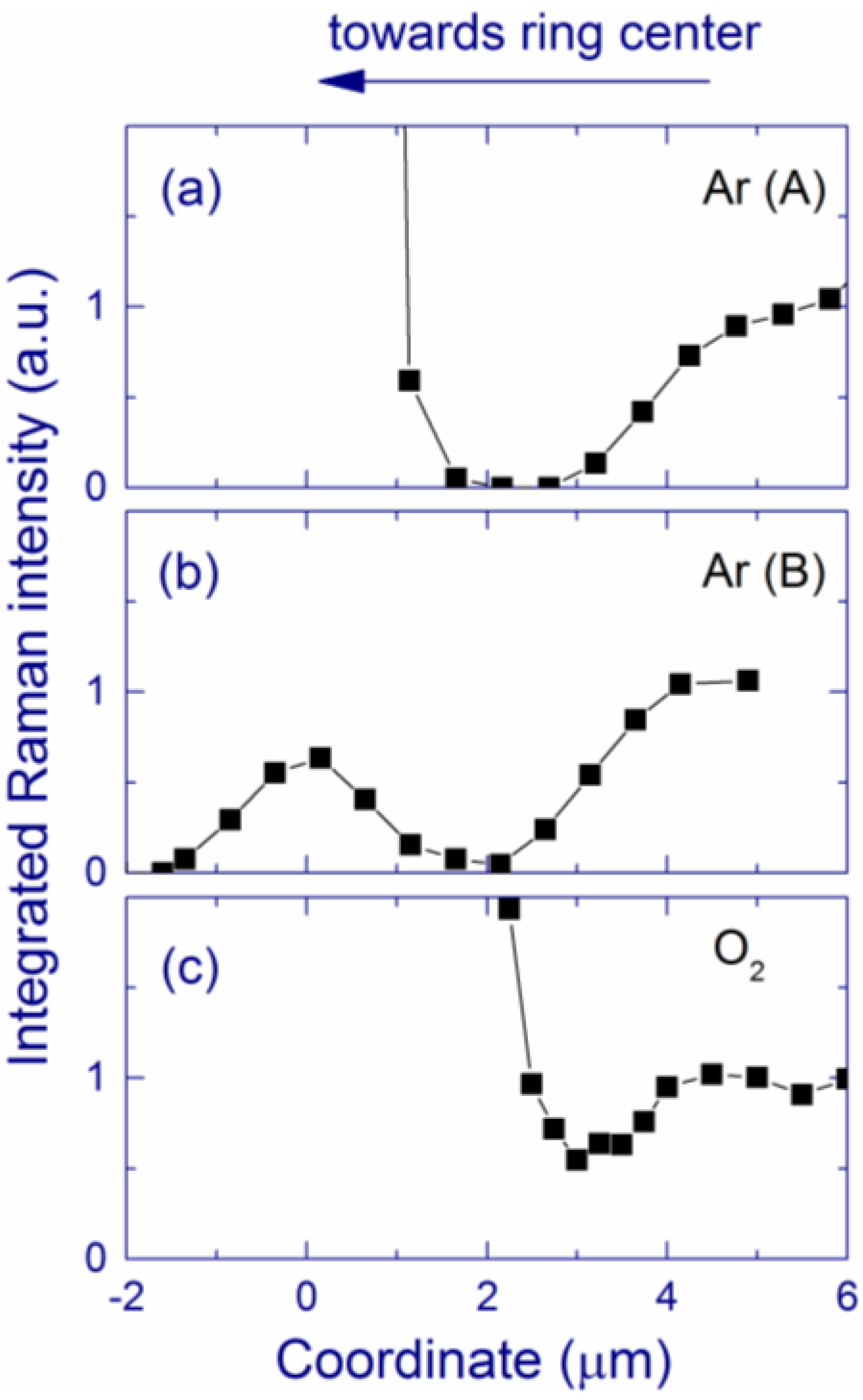The studies described above have been performed in the atmosphere of air (containing ~20% of oxygen), which can cause some oxidation of Si during laser annealing. Indeed, oxygen can diffuse through the film oxide to Si-nc [148,149,150]. This process may decrease the excess of Si, especially in the central region, where the temperature in the beginning of laser annealing is the highest. To evaluate this effect, we compare laser annealing in atmospheres containing different amounts of oxygen (Ar, N2, O2, and air). Detailed measurements are performed for 0.5-μm-thick Si/SiO2 SL and 1-s exposure [142].