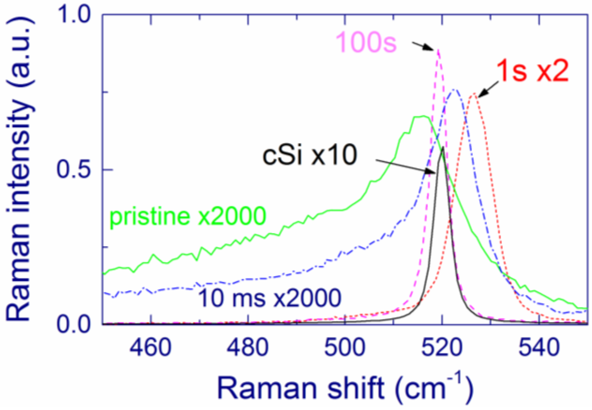 Laser annealing is an interesting approach to change the structural and optical properties of Si-based materials. The heating effect of pulsed radiation is especially strong [92]. However, it can also be substantial for continuous-wave (CW) irradiation of free-standing porous Si films [93]. A similar heating effect of CW laser radiation is observed in free-standing SiOx films leading to a strong increase of the Raman signal of Si-nc [56,94,95,96]. Si-nc prepared by laser annealing show high compressive stress (~3 GPa), which is evidenced by an up-shift of the Raman band [56,96]. The compressive stress is formed in a solid SiO2 matrix when the volume of Si-nc suddenly increases after its crystallization from the liquid phase. The high stress can be relaxed by irradiating the stressed Si-nc with lower laser power [56]. Free-standing films are used to obtain the above described laser-induced effects because for films on substrates the laser-induced heat is reduced due to thermal flux to substrate [97]; however, it is still observable [98].