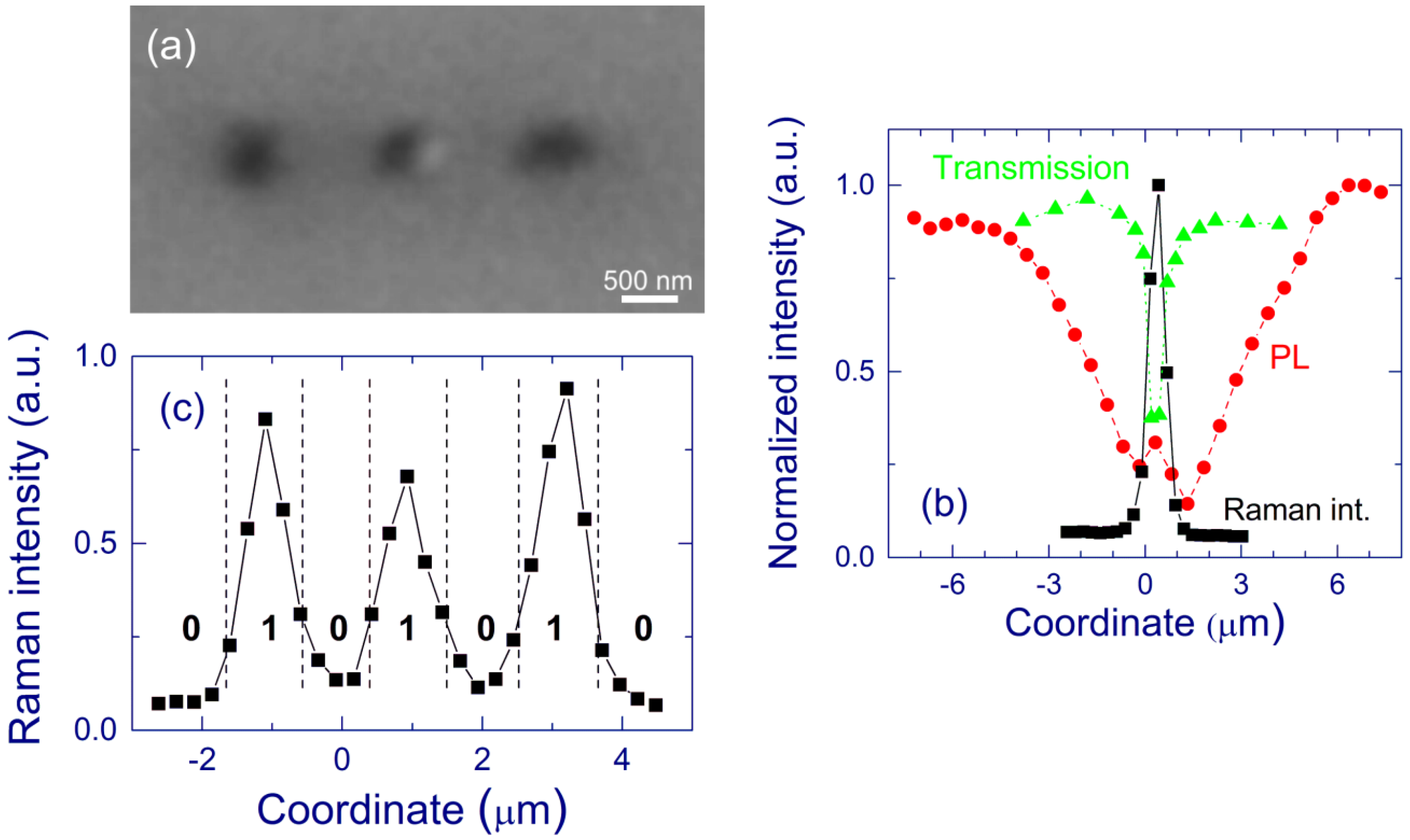 (a) Raman spectra of a laser-annealed 2-μm-thick SiOx (x ~ 1.7–1.8) film from regions in the center (in), on the ring (on), and outside the laser-annealed area (out). (b) Raman (circles), PL (stars), and transmission (triangles) cross-sections of the laser-annealed area. The cross-sections are measured in the vertical direction through the center of the laser-annealed area shown in Figure 11. Reproduced with permission from [140]. Copyright 2010, AIP Publishing LLC.