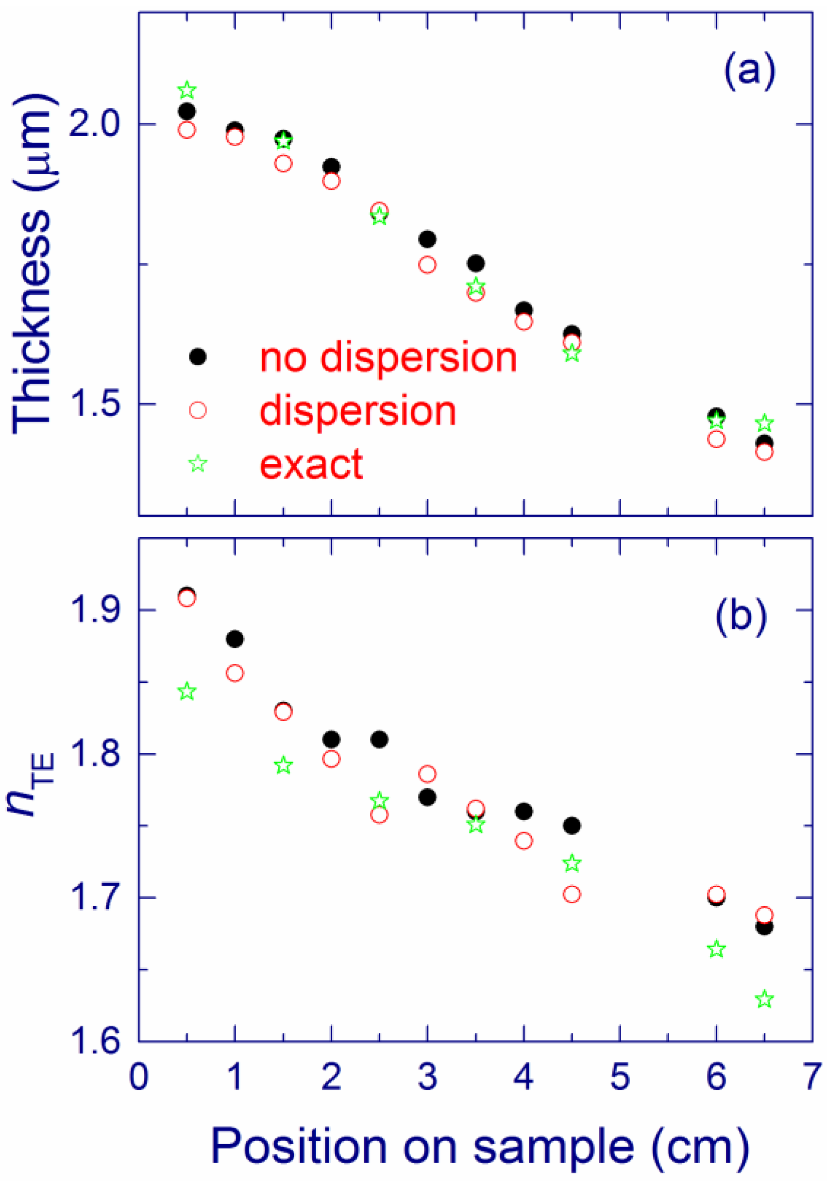 The SiOx film material prepared by MBD is found to be birefringent [79]. The classical theory of an isotropic asymmetrical planar waveguide predicts that the cut-off positions for the TE modes (with polarization parallel to the film) are at longer wavelengths than the TM cut-off positions (with polarization perpendicular to the film) [126,127]. However, the opposite order between the TE and TM peaks is found for some samples (see Figure 20a in Section 3.3). This reversed order of the TE and TM peaks is explained assuming positive optical birefringence, which is connected with the non-spherical shape of Si-nc [79]. Non spherical Si-nc have been observed in similar materials using the combination of electron tomography with plasmon-filtered microscopy [128]. It appears that that the optical birefringence is higher for SiOx films with the higher Si content and for lower annealing temperature (Figure 4b) [79,116]. Similar values of birefringence are obtained by m-line measurements [115].