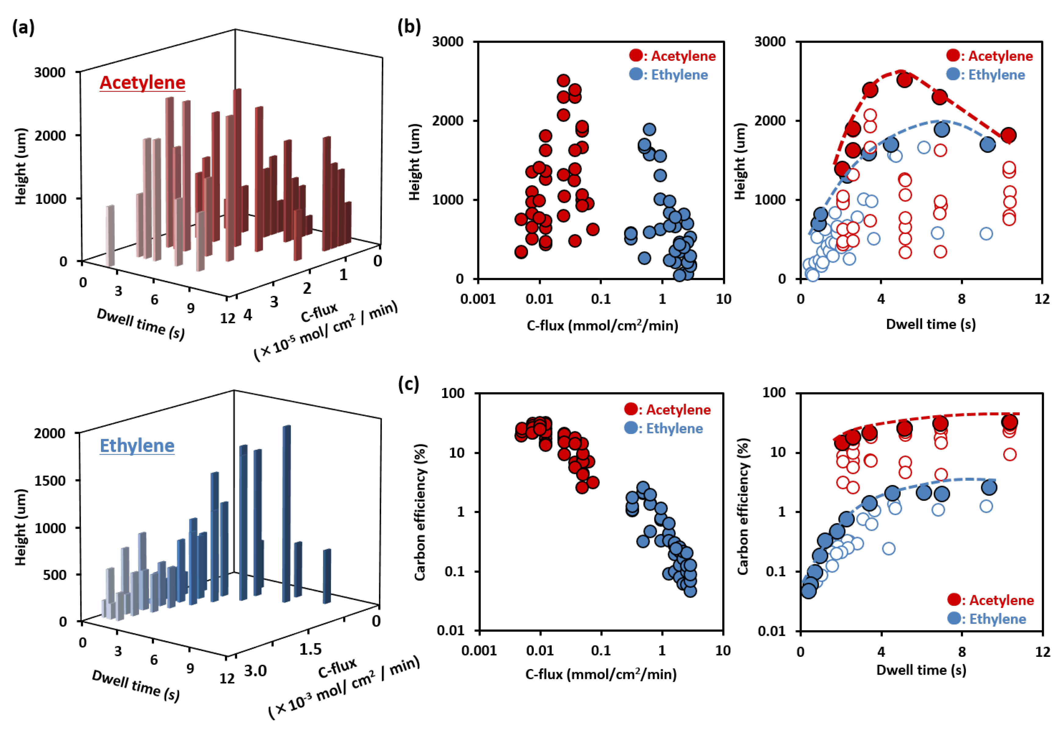 (a) Three-dimensional mapping of single-walled carbon nanotubes (SWCNTs) height as functions of dwell time and carbon flux for acetylene (upper), ethylene (lower); (b) Two-dimensional mapping of SWCNT height as a function of dwell time and carbon flux. Peak positions at each dwell time are marked as solid circles; (c) Carbon efficiency as a function of the dwell time and carbon flux. Peak positions at each dwell time are marked as solid circles.