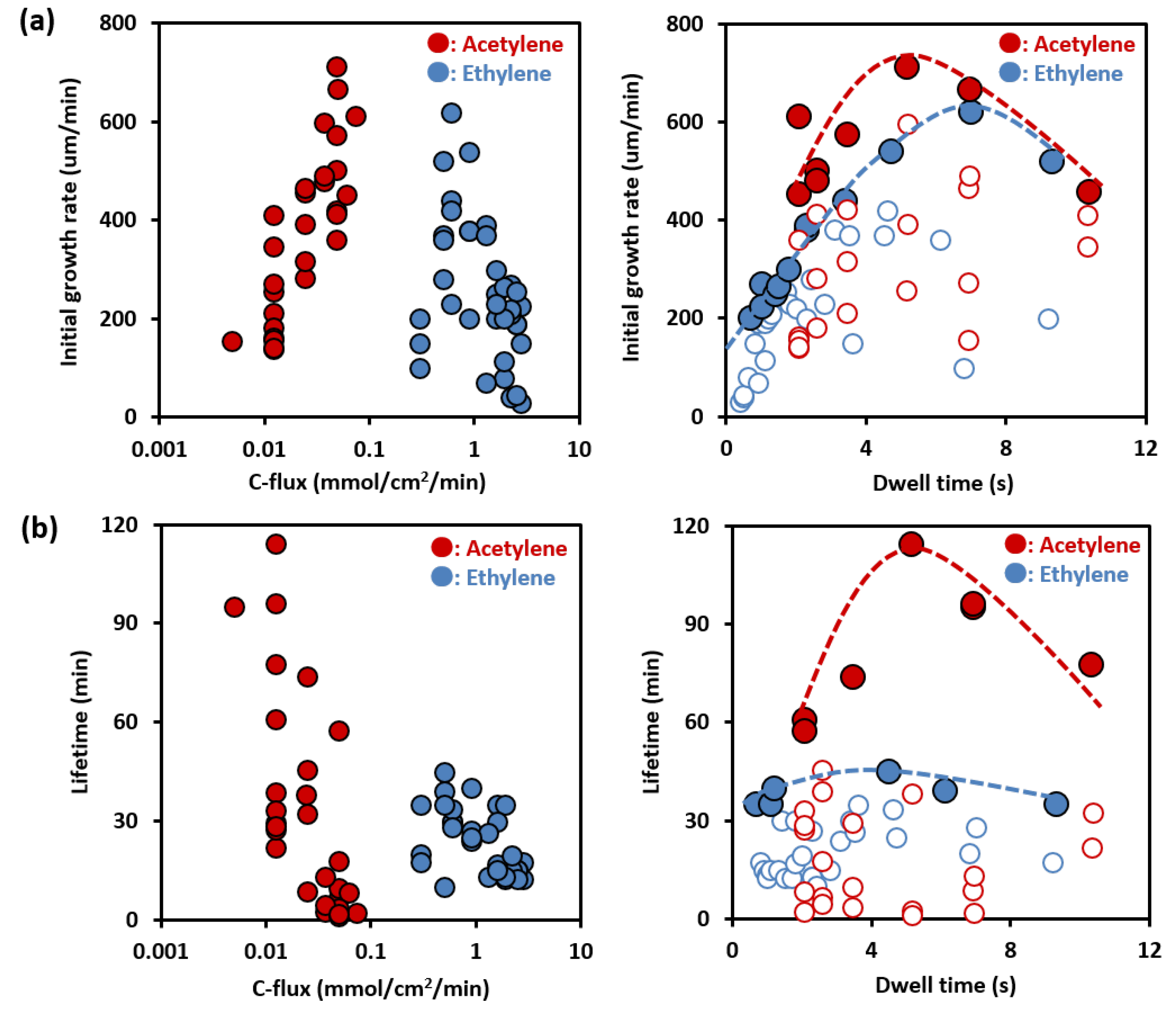 Two-dimensional mapping of (a) initial growth rate; and (b) life time as functions of dwell time and carbon flux. Blue and red circles show SWCNT growth using ethylene and acetylene, respectively. (Growth temperature: 1083 K of acetylene, 1073 K of ethylene, growth time: 10 min).