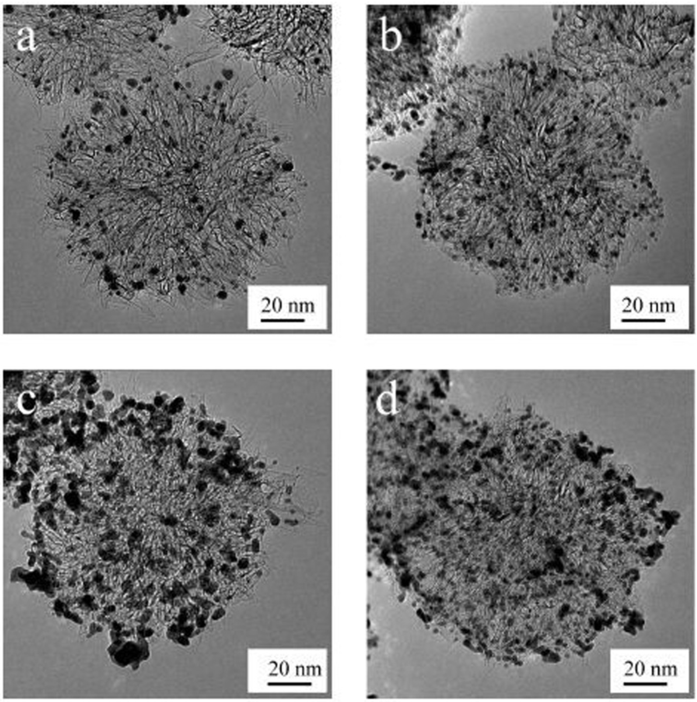 Transmission electron microscope (TEM) images of the supported catalyst: (a) 20 wt % Pt on as-grown single-walled carbon nanohorns (SWCNHs); (b) 20 wt % Pt on treated-SWCNHs; (c) 60 wt % Pt on as-grown SWCNHs; (d) 60 wt % Pt on treated SWCNHs. Reproduced with permission of [29]; American Chemical Society, 2009.