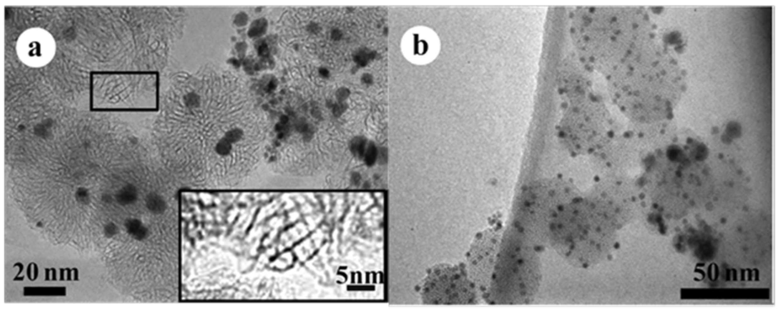 TEM images of (a) Pd-Pt/SWCNHs and (b) Pd-Au/SWCNHs synthesized by the GI-AIW method. The inset (in Figure 2a) resolves the horn structures of SWCNHs. Reproduced with permission of [40]; American Chemical Society, 2014.