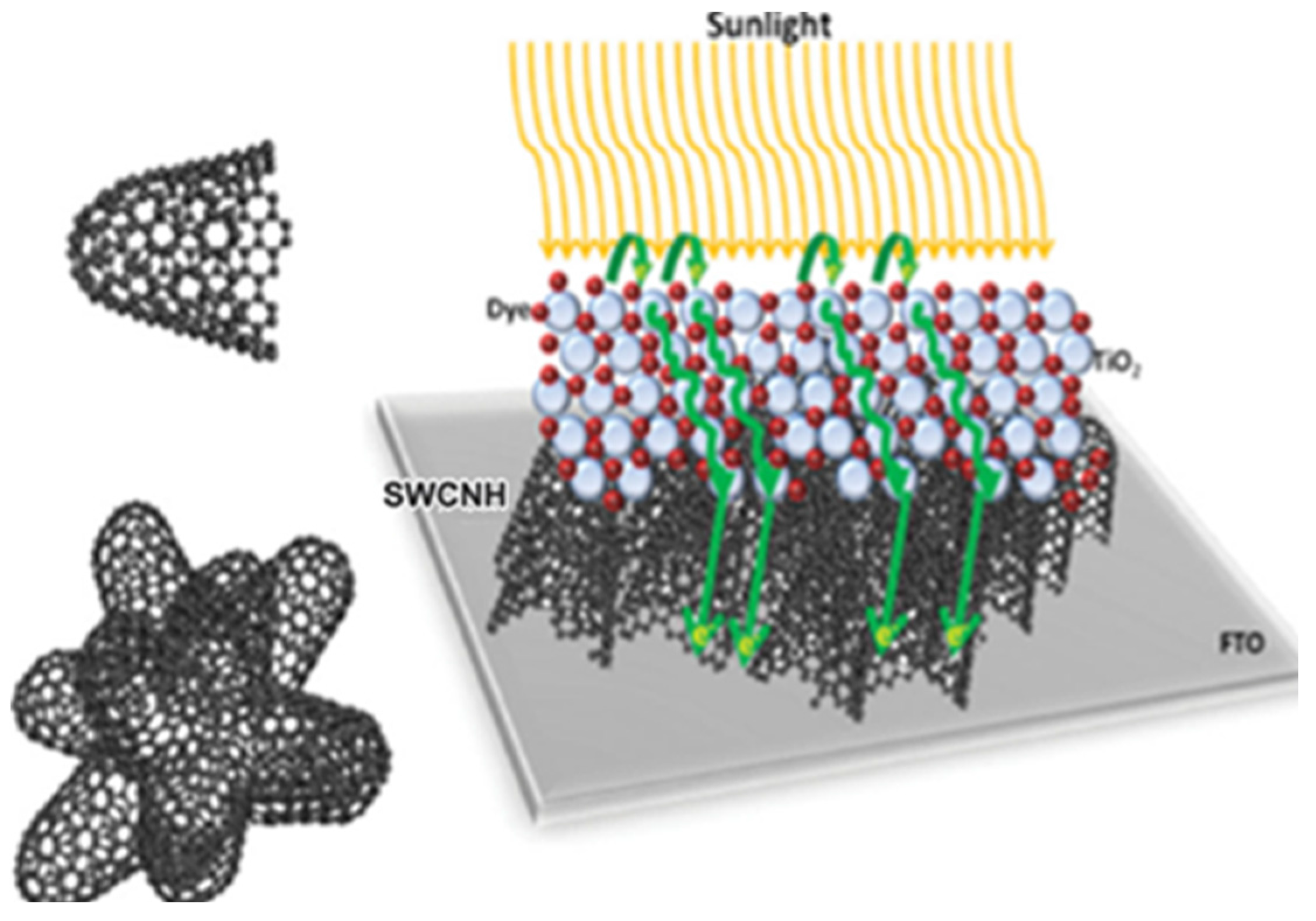 Left: Representation of a SWCNH (top) and a bundle-like SWCNH-aggregate present in solution (bottom). Right: Schematic representation of the proposed mechanism in the electrode architecture when SWCNH bulk material is implemented as an interlayer between the FTO/TiO2. Reproduced with permission of [51]; John Wiley and Sons, 2014.