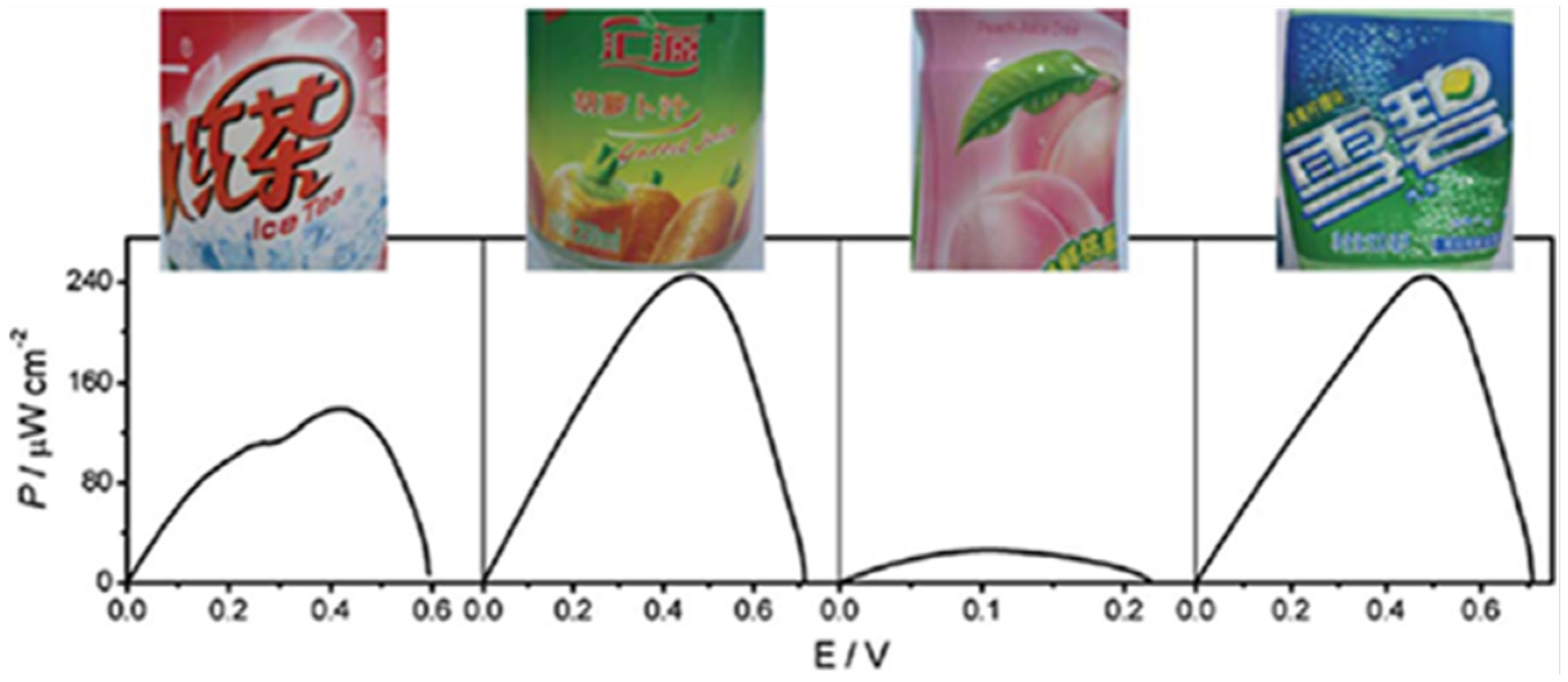 The power outputs of the glucose/air BFC harvesting energy from different kinds of soft drinks (from left to right: iced red tea, vegetable juice, fruit juice, and aerated water). Reproduced with permission of [54]; Royal Society of Chemistry, 2011.