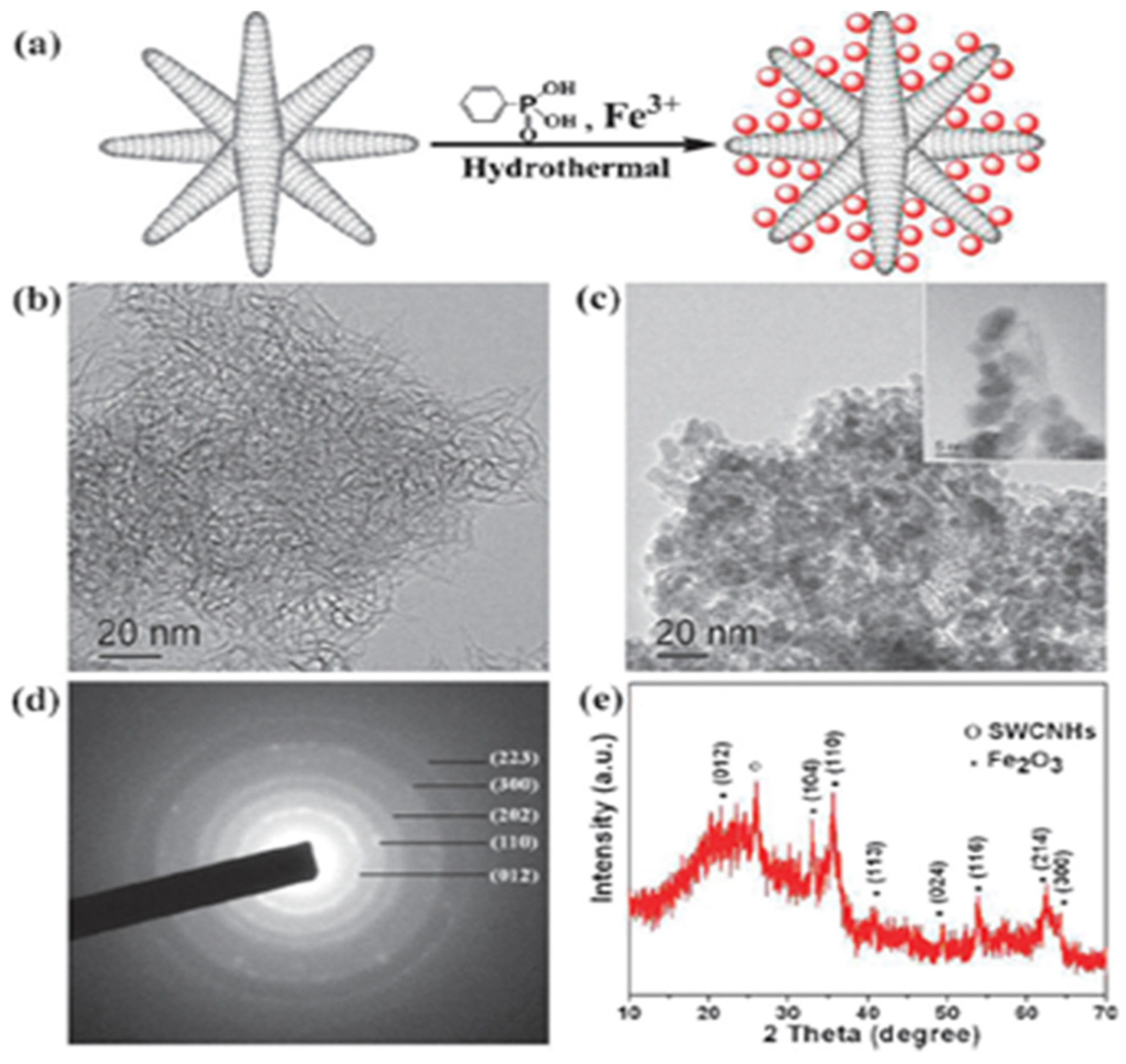 (a) Schematic synthesis of Fe2O3/SWCNHs composite; (b) TEM image of SWCNHs. (c) TEM image of Fe2O3/SWCNHs composite inset shows the HRTEM picture of Fe2O3 particles decorated on the wall of SWCNHs; (d) and (e) are the corresponding selected area electron diffraction and XRD pattern of Fe2O3/SWCNHs composite. Reproduced with permission of [62]; Royal Society of Chemistry, 2011.