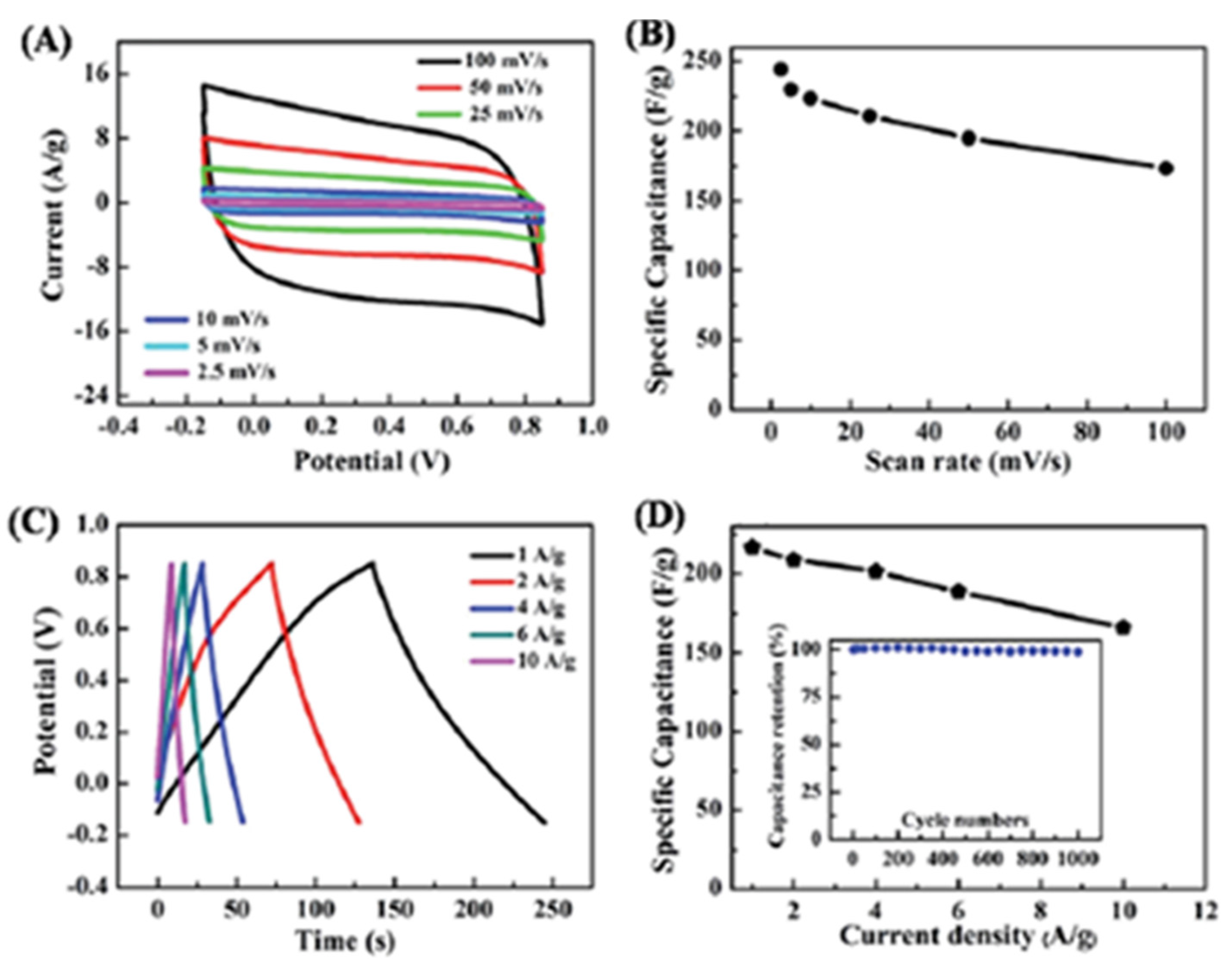 Electrochemical characterization of G/SWCNHs in 1 M KOH aqueous solution at room temperature. (a) CV curves at different scan rates. (b) Specific capacitance versus scan rate. (c) GCD curves at different current densities ranging from 1 A·g−1 to 10 A·g−1. (d) Specific capacitance as a function of current density; inset shows capacitance retention versus cyclic number. Reproduced with permission of [81]. Royal Society of Chemistry, 2015.