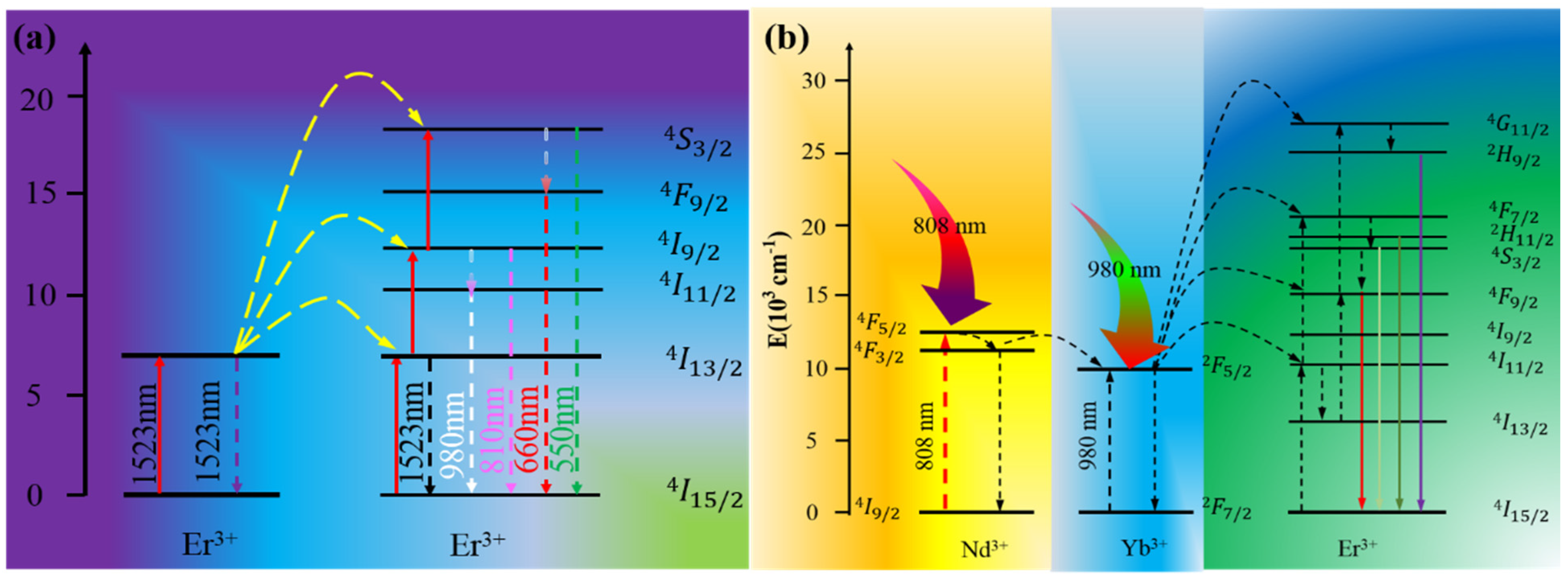 The upconversion mechanisms for (a) single Er3+ doped upconversion particles (UCNPs) excited under 1523 nm laser exciation; (b) Nd3+-Yb3+-Er3+ tridoped system under 808 nm or 980 nm laser exciation.
