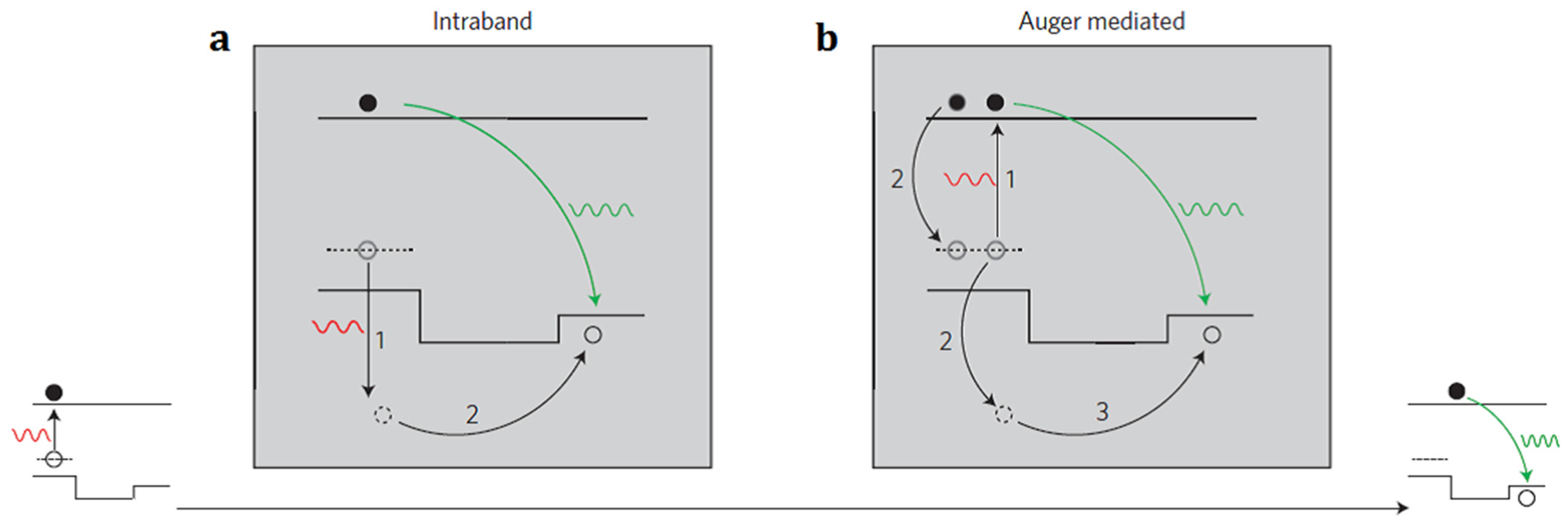 Upconversion in quantum nanostructures is realized through a design of a compound semiconductor nanocrystal, which incorporates two quantum dots with different bandgaps separated and connected by a tunneling barrier (a semiconductor rod). The implementation of upconversion is through a two-step absorption of two subsequent photons. The first photon generates an electron-hole pair via interband absorption in the lower-energy core (small band-gap dots), leaving a confined hole and a delocalized electron in the compound semiconductor nanocrystal. The second absorbed photon can lead, either directly or indirectly, to further excitation of the hole, enabling it to cross the barrier layer. The direct way is through an intraband absorption of the photon by the confined hole at the lower-energy core (Figure 5a), while the indirect way is via an Auger mediated energy transfer process (Figure 5b).The Auger process describes a recombination of the second electron-hole pair, generated by absorbing the second photon, while simultaneously allowing nonradiative energy transfer to the confined hole at the lower energy core (small band-gap dots), empowering it to cross the barrier to the higher energy quantum dot (large band-gap dots). This, in turn, is followed by a radiative recombination with the delocalized electron, producing upconverted luminescence. This system combines the stability of an inorganic crystalline structure, with the spectral tunability afforded by quantum confinement. Since the absorption, emission, and lifetime of the semiconductor nanocrystals can be controlled by variation of their size, shape, as well as composition, upconversion in quantum nanostructures holds prime promise for applications in PV devices. However, a relative high excitation density (~104 W/cm2) is needed to activate this type of upconversion. Lowering the excitation density to the range of sun irradiation (~10−1 W/cm2) is an inviting direction, which could produce a pronounced impact for PV applications in a straightforward way.