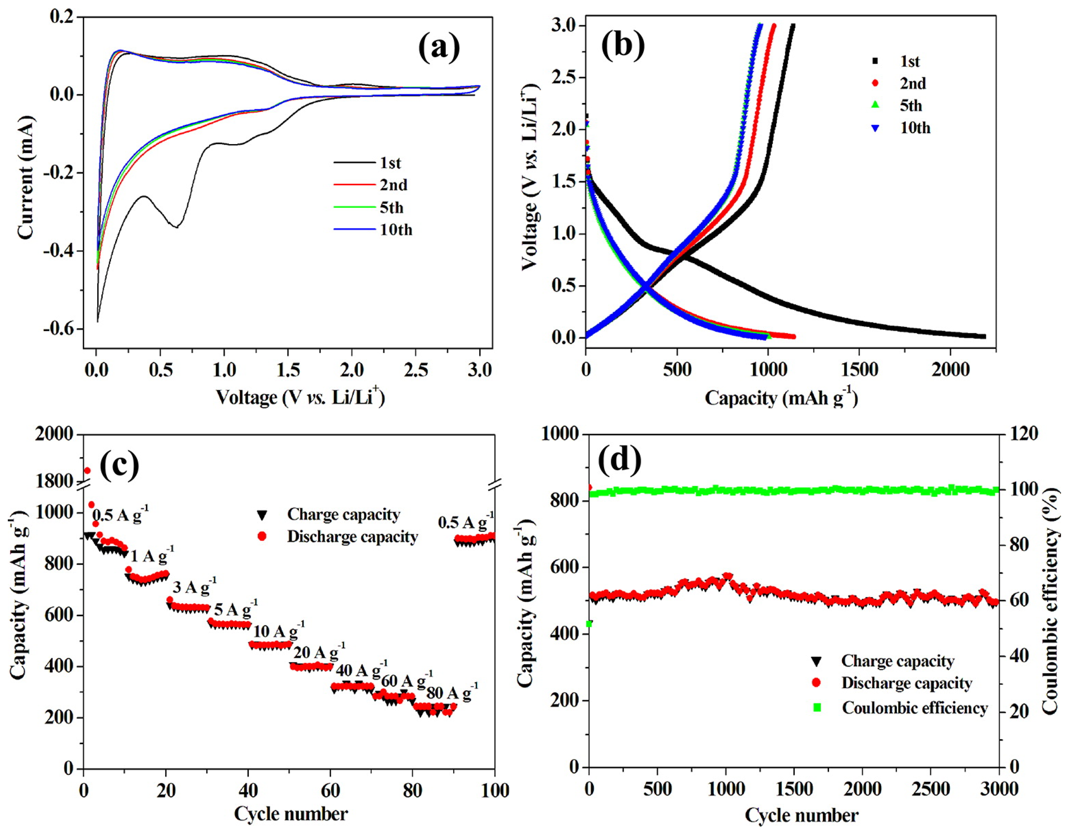 Electrochemical performance of the doped hierarchically porous graphene electrodes. Reproduced with permission from [30]. Copyright The American Chemical Society, 2013. (a) Cyclic voltammograms at a scan rate of 0.1 mV·s−1; (b) charge-discharge curves at 0.1 A·g−1; (c) capacity over cycling at different current densities; and (d) cycling and Coulombic efficiency at current density of 5 A·g−1.