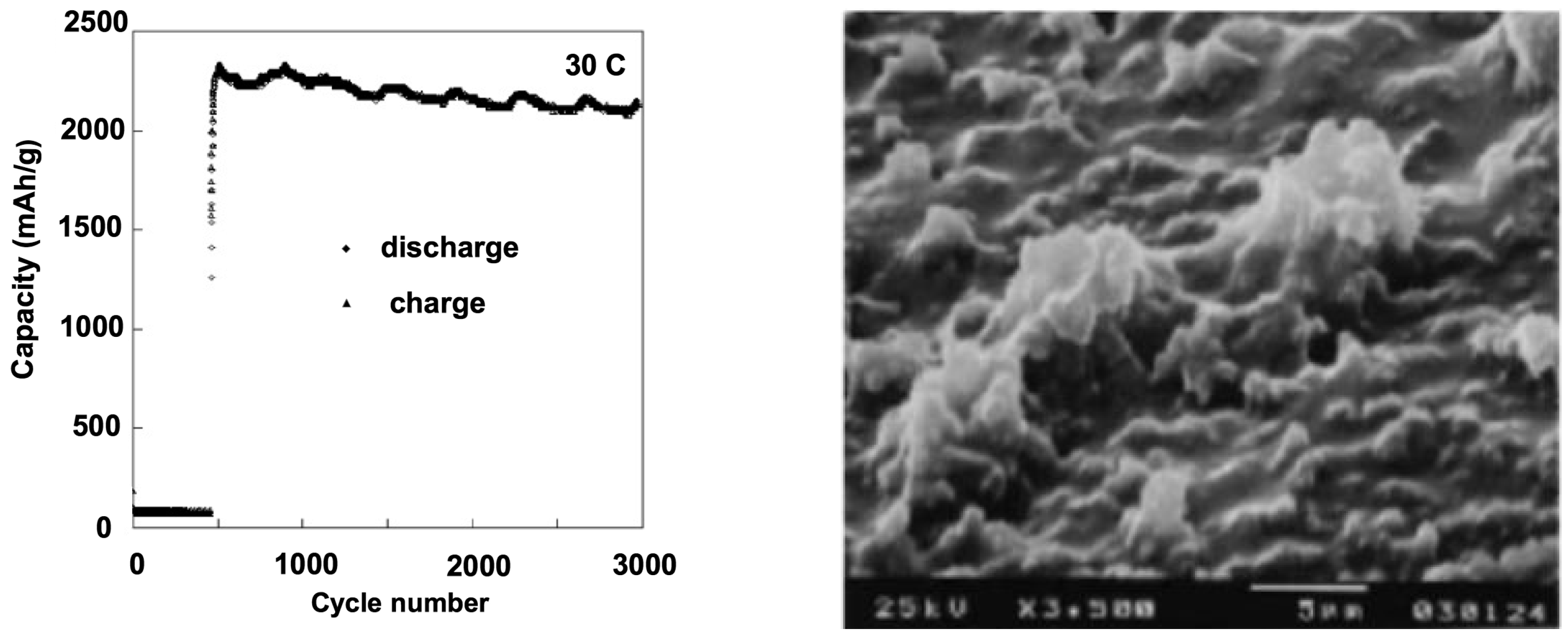 Capacity retention of 500 Å thick n-Si film during charge/discharge cycling with 30 C rate charge/discharge in propylene carbonate containing 1 mol·L−1 LiClO4. The scanning electron microscopy (SEM) image of the Si film is shown after 1000 cycles. Reproduced with permission from [54]. Copyright Elsevier, 2004.