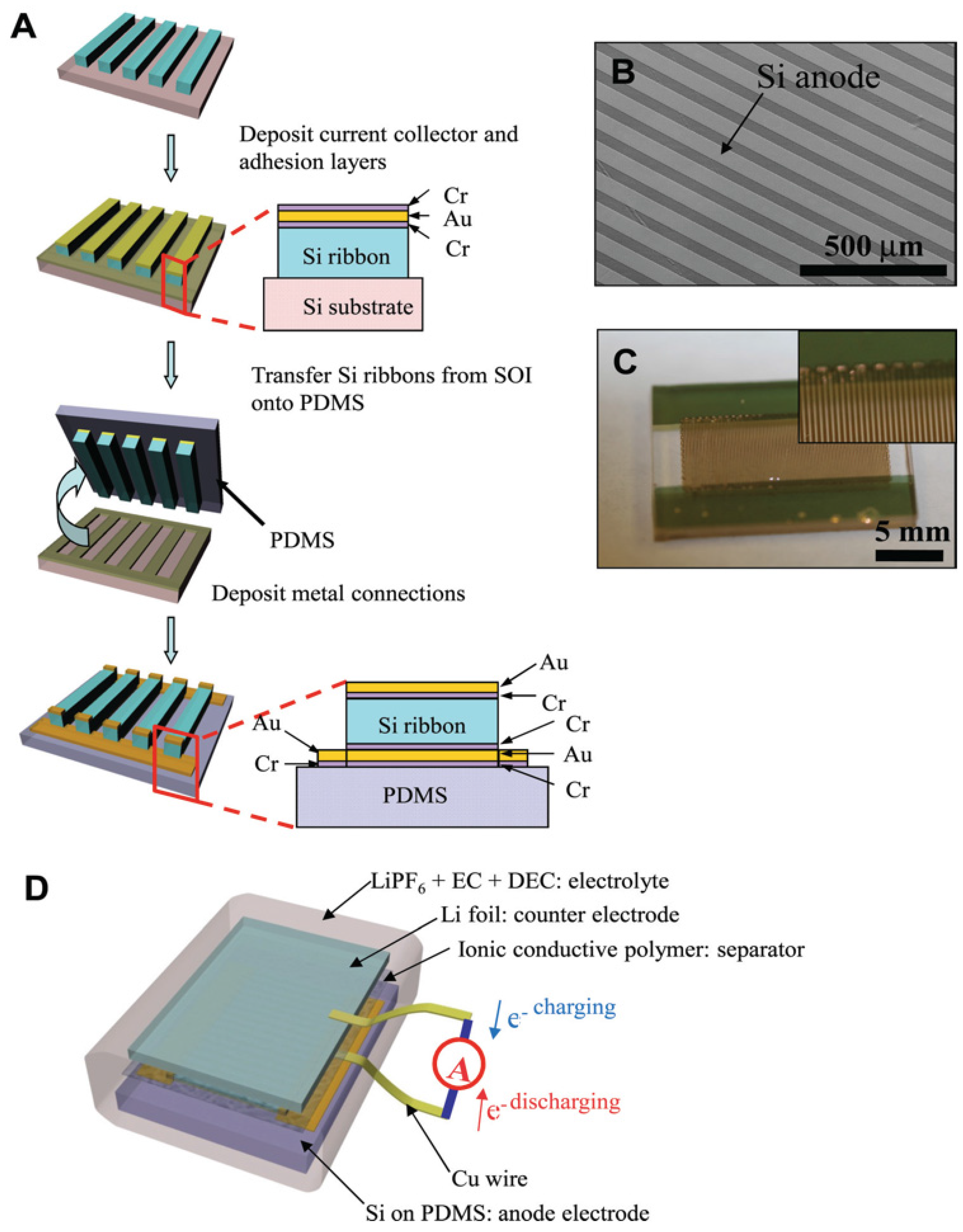 Half-cell lithium ion battery based on Si anodes, produced by microfabrication. Reproduced with permission from [58]. Copyright Wiley, 2012. (A) Schematic steps to fabricate the Si anodes on Poly(dimethylsiloxane) (PDMS) substrates; (B) A SEM image of Si anode on PDMS; (C) Optical images of fabricated anode before assembling; and (D) an illustration of the battery cell assembly.