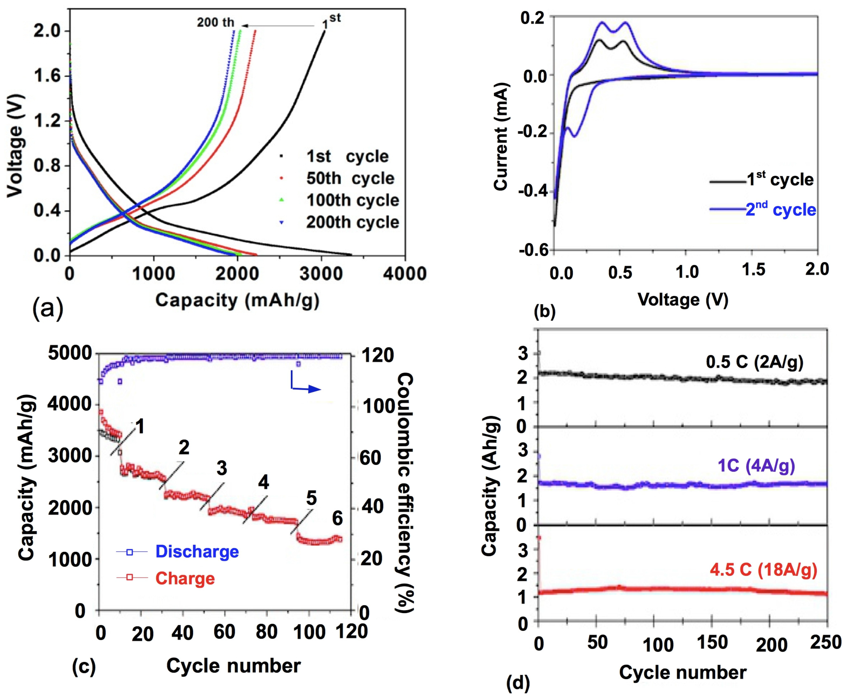Electrochemical performance of a battery using porous silicon nanowires as the anode and lithium metal as the current collector (SEM and transmission electron microscopy (TEM) images of the nanowires are shown in Figure 5). Reproduced with permission from [32]. Copyright Wiley, 2012. Si mass loading was around 0.3 mg·cm−2. (a) Charge/discharge profile within a voltage window of 0.01−2 V vs. Li0/Li+ for the first cycle at a current rate of 0.4 A·g−1 and the 50th, 100th, and 200th cycles at 2 A·g−1; (b) cyclic voltammetry curves of porous silicon nanowire electrode for the first and second cycles using a voltage window 0.01−2 V at rate of 0.1 mV·s−1; (c) charge/discharge capacity and coulombic efficiency of porous silicon nanowire electrode at current rates of 0.6, 1.2, 2.4, 3.6, 4.8, and 9.6 A·g−1; (d) charge/discharge capacity of a porous silicon nanowire electrode at current rates of 2, 4, and 18 A·g−1 for 250 cycles; and (e) charge/discharge capacity of a porous silicon nanowire electrode at current rates of 2 A·g−1 (0.5 C) and 4 A·g−1 (1 C) with an additional 2000 cycles.