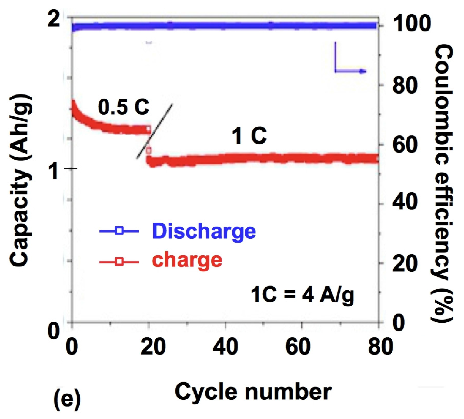The quantum confinement modifies the electronic and structural properties, which is beneficial to the storage capacity by removing the limitation of the capacity to 372 mAh·g−1 [3,4,5,6,7,8]. The increase of the number of storage sites available for the lithium ions in small closed spaces in nano-structured carbon is another reason invoked to explain the large capacities that have been observed [9,10,11]. Carbon nano-rings with 20 nm outer diameters and 3.5-nm wall thickness deliver a capacity 1200 mAh·g−1 over hundreds of cycles at the current density of 0.4 A·g−1. At the higher current rates of 45 A·g−1, the capacity is still 500 mAh·g−1 [12].