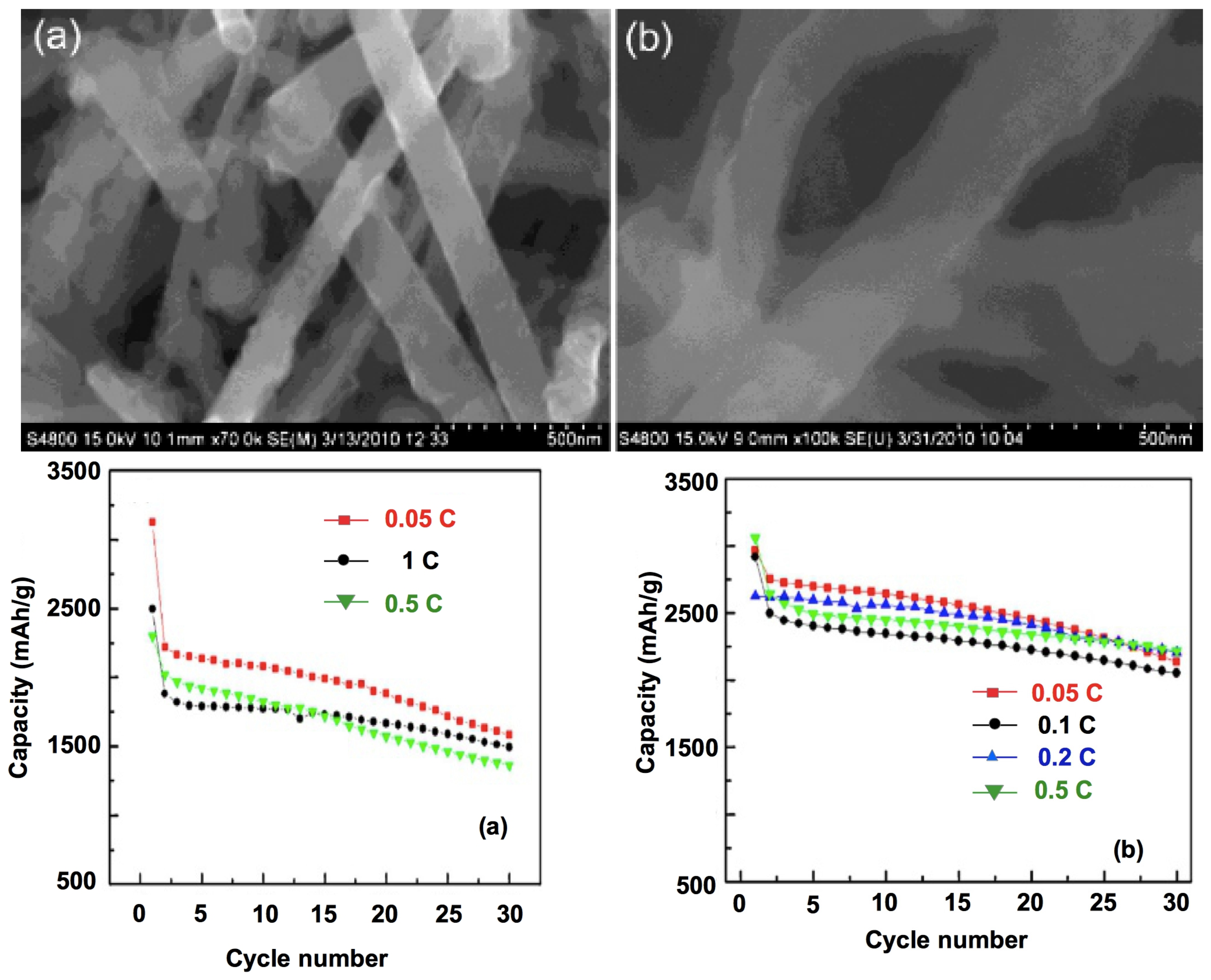 Top: SEM images of the silicon nanowires (Si Nws) (a) with and (b) without copper-coating after 100 cycles at the rate of 0.5 C; Bottom: capacity–cycle number curves for Si nanowires (a) without and (b) with copper-coating at different rates. Reproduced with permission from [97]. Copyright Elsevier, 2011.