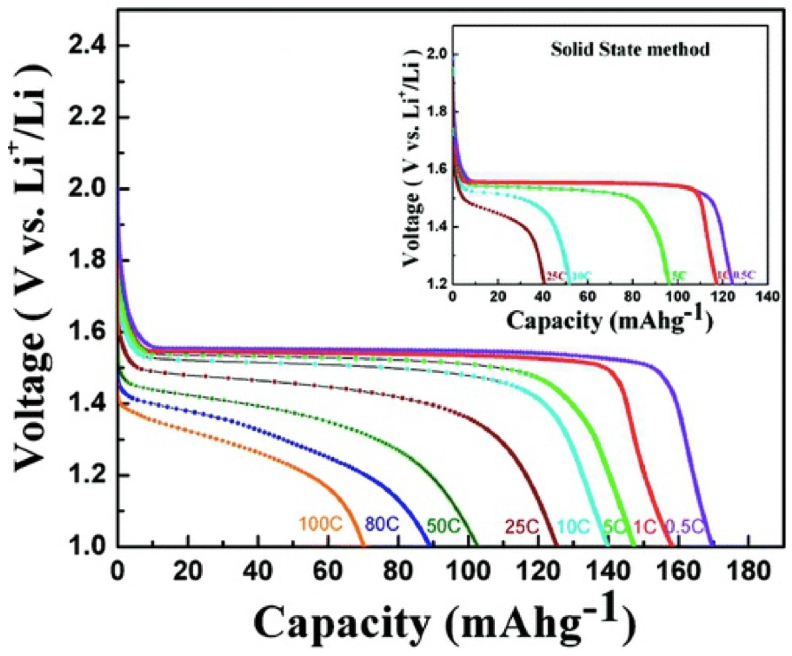 Capacity-voltage profile for nanocrystalline Li4Ti5O12 (SEM images in Figure 7) synthesized by the combustion method at different C-rates. Inset shows capacity voltage profile for bulk Li4Ti5O12 prepared by the solid-state method. Reproduced with permission from [108]. Copyright Elsevier, 2014.