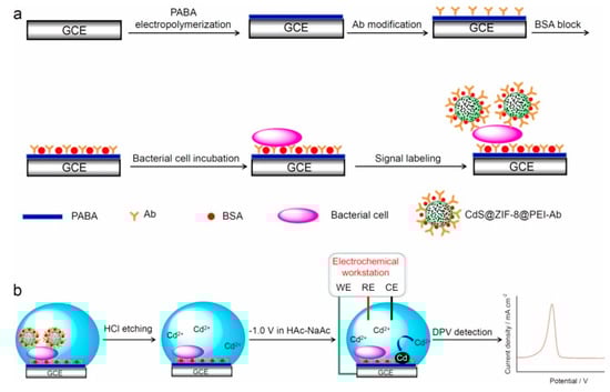 (a) Schematic diagram of the fabricated steps of the electrochemical biosensor for E. coli O157:H7 using CdS@ZIF-8 as signal tags, (b) Illustration of the detection steps by DPV. (GCE, glassy carbon electrode; PABA, Poly(p-aminobenzoic acid); Ab, antibody; BSA, bovine serum albumin; Cds, cadmium sulfide quantum dots; ZIF-8, zeolitic imidazolate framework-8; PEI, polyethyleneimine; WE, working electrode; RE, reference electrode; CE, counter electrode; HCL, hydrochloric acid; DPV, differential pulse voltammetry) [].