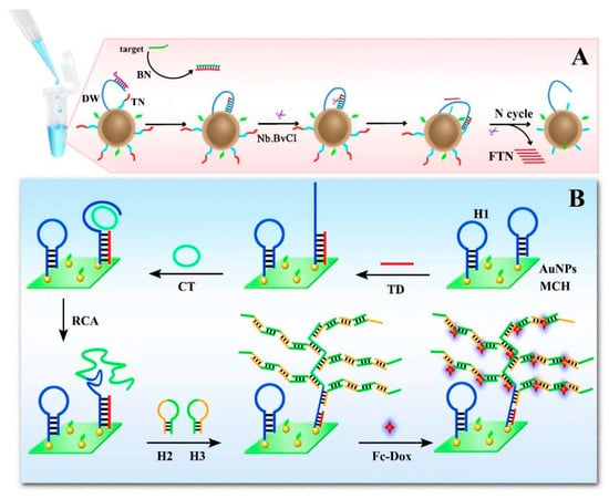 Schematic illustration of the electrochemical biosensor for E. coli O157:H7 detection. (A) Schematic illustration of the 3D DNA walker-based amplification reaction triggered by the target gene for transfer oligonucleotide fragment production; (B) Illustration of amplification reactions based on HCR and RCA on the surface of electrode to produce long double stranded DNA sequences for greater immobilization of electrochemical indicators associated with the target gene’s concentration. (Au NPs, gold nanoparticles; BN, blocking DNA; CT, circular template; DW, DNA walker; FTN, fragment of TN; H1, hairpin DNA1; H2, hairpin DNA2; H3, hairpin DNA3; HCR, hybridization chain reaction; MCH, 6-mercapto ethanol; RCA, rolling circle amplification; TN, transfer oligonucleotide) [].