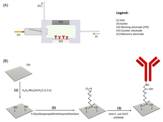 Schematic illustration of electrochemical cell (A) fabrication of immunosensor (B): hydroxylation (1), silanization (2), and antibody binding (3) [].