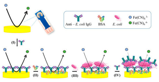 Schematic illustration of the stepwise functionalization and detection of the proposed immunosensor. The black line shows the redox reaction intensity, which is inhibited as the surface covering grows. Its thickness reduction is related to decrease of the “effective” area available for the electrolyte current, which is measured through an increase of the charge transfer resistance. (I: functionalization of the surface with antibodies, II: blocking the free remaining spaces on the gold electrode by BSA, III: reaction of immobilized antibodies and the E. coli cells, IV: conveying a fresh anti-E. coli Abs solution to the circuit) [].
