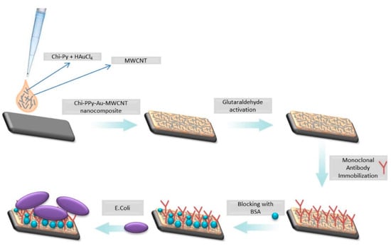 - Güner, A.; Çevik, E.; Şenel, M.; Alpsoy, L. An electrochemical immunosensor for sensitive detection of Escherichia coli O157: H7 by using chitosan, MWCNT, polypyrrole with gold nanoparticles hybrid sensing platform. Food Chem. 2017, 229, 358–365. [Google Scholar] [CrossRef] [PubMed]