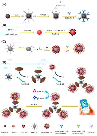 A schematic diagram of the preparation process of Ab-Fe3O4@SiO2 NPs (A), Au@Pt NPs (B), Ab/invertase-Au@Pt/SiO2 NPs (C); Experimental process of E. coli O157:H7 detection employing Ab-Fe3O4@SiO2 NPs and Ab/invertase-Au@Pt/SiO2 NPs based on PGM (D) [].