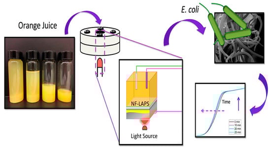- Shaibani, P.M.; Etayash, H.; Jiang, K.; Sohrabi, A.; Hassanpourfard, M.; Naicker, S.; Sadrzadeh, M.; Thundat, T. Portable nanofiber-light addressable potentiometric sensor for rapid Escherichia coli detection in orange juice. ACS Sens. 2018, 3, 815–822. [Google Scholar] [CrossRef]