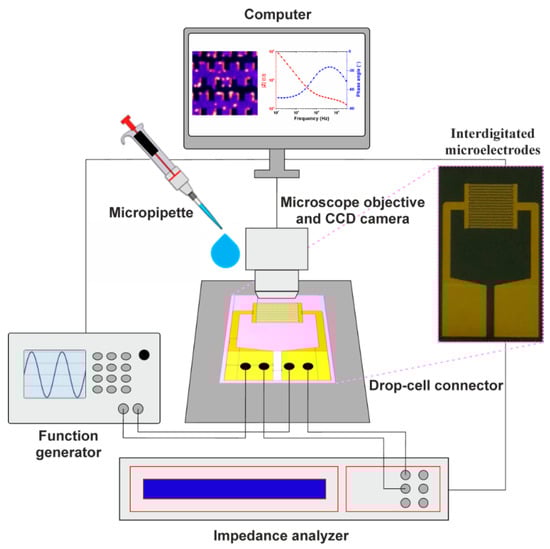 The experimental activity in this study involved trapping the cells via dielectrophoresis to determine the crossover frequency by observing the cells’ motion and characterization of the trapped cells via electrical impedance spectroscopy. Figure 1 depicts a schematic diagram of the proposed experimental structure. The set-up operation procedure involved two main steps: (1) trapping the cells at the microelectrode level via DEP and (2) identification of the cell’s type by measuring its impedance characteristics. The test section of the microchip consisted of the electrode substrate on the bottom and a glass cover on the top for observation of the cells. For the DEP experiments, a Keysight 33521A Function/Arbitrary Waveform Generator was employed to generate a sinusoidal AC electric field. The cell’s distribution at microelectrode level was monitored and recorded using an improvised optical setup consisting of a Nikon Plan Fluor 10x/0.30 microscope objective with a mounted CCD Nikon Digital Sight DS-Qi1Mc camera connected to a computer that was running NIS-Elements AR 3.0 SP 1 (Build 455) software. Electrical impedance spectroscopy measurements were performed using a Novocontrol Broadband Dielectric Spectrometer (Alpha-A High-Performance Frequency Analyzer). The electrodes were connected to the analyser and generator by using a Micrux drop-cell connector. The impedance experimental data were fitted with the software EIS Spectrum Analyser 1.0 program [].