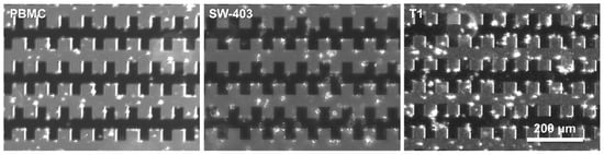 In the presence of an inhomogeneous electric field gradient, the biological cells may be displaced towards the electric field maxima (positive DEP) or towards the electric field minima (negative DEP) depending on the dielectric properties of the specific cell and on the properties of the suspending media. In a first experiment, normal (PBMC) and tumor cells (SW-403 cell line and primary tumor cells T1) were subjected to a sinusoidal excitation voltage (9 V peak-to-peak magnitude and a frequency of 1 MHz) that was applied to the electrodes, for approximately 5 min to concentrate the cells on the electrodes. Under the effect of p-DEP, after few seconds () the cells concentrated at the electrode surface (see the Supplementary Material). Figure 2 depicts the microscopic images of cell samples before and after (5 min) DEP manipulation. It is visible that under these experimental conditions the majority of the cells of both normal and tumor cell populations were displaced towards the highest electric field regions. Moreover, in some regions the cells followed electric field lines between adjacent microelectrodes due to their high interfacial polarization, creating “cells’ bridges”. Before and after the cells were trapped at the level of microelectrodes, the impedance measurements were carried out to differentiate the normal cells from cancer ones.