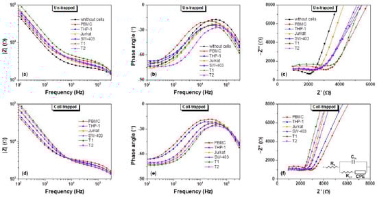 Electrical impedance spectroscopy responses (amplitude Z (a,d), phase angle (b,e), and Nyquist plots (c,f)) of different cell types suspended in buffered sucrose solution, before and after cells trapping.
