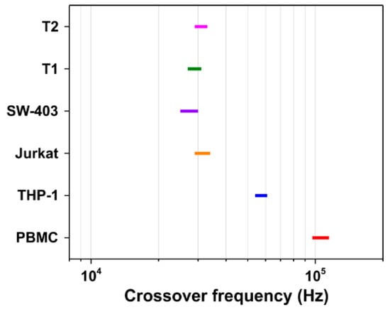 The DEP crossover frequency () is the characteristic frequency at which the polarity of the dielectrophoretic force changes and cells experience zero DEP force. By observing the motion of cells at the electrode edges when the frequency that is applied is slowly swept, the  of each cell type can be ascertained [,]. In our dielectrophoretic crossover frequency experiment, the microchip was powered by an AC voltage with 12 Vpp of variable frequency at the level of two adjacent microelectrodes. It should be mentioned that the DEP operating voltage was not affecting the impedance spectra (please see the Supplementary information file, Figure S2) when the experiments were running during the same period of time, however, for the crossover frequency experiments we choose 12 Vpp voltage as the displacement of the cells is more visible. The voltage frequency was sequentially increased from 10 kHz up to 1 MHz and the cell displacements induced by the DEP force were examined with a microscope. The crossover frequency at which the cell exercised no DEP movement was recorded. Within individual experiments, at least 10 frequencies were determined for each cell type and all measurements were performed at room temperature.