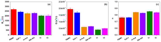 By fitting the impedance measurements after DEP trapping, as we expected, the extracted resistance of the solutions and double layer capacitances were similar for all of the types of cells involved in our experiment, with an average value of  and . As shown in Figure 5a, the extracted charge transport resistances  of tumor cells T1 and T2 were approximately equal but their values were lower than the ones of normal PBMC cells. It was noticeable that the value of parameter  for PBMC cells was higher in comparison to values of the cancerous lines that were involved in the study even if, in the case of THP-1, the difference was not considerable. The extracted magnitudes  and  constant of ZCPE for the cancer cells were in the range of –  and –, respectively, while those for the normal cells were in the range of –  and –, respectively (Figure 5b,c). Moreover, the values of  and  of PBMC cells were very different in comparison to the values of the same parameters of Jurkat, SW-403, T1, and T2 tumor cells but close to the values for THP-1 cells. The less evident difference between the PBMC and THP-1 may be attributed to the fact that, as stated in Section 3.1, the THP-1 cell line is regarded as a model for primary monocytes. Moreover, the fact that under p-DEP, cells migrated towards the electrode interface, as is visible in Figure 2, so all charge transport phenomena at this interface is mediated and altered by these cells. Thus, the Randles circuit transport elements,  and , were influenced by the cells’ size and morphological characteristics (i.e., their dielectric phenotype), especially the cell membrane features since they facilitated all of the charge transport to and from the extracellular medium.