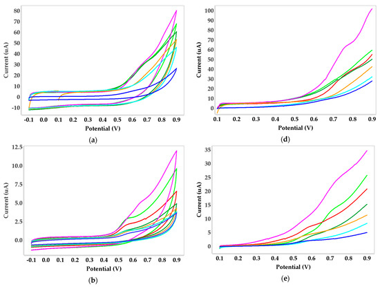 Over all methods tested, both cyclic voltammetry and linear sweep voltammetry showed redox peaks for the silver screen-printed electrode (SPE) that indicate it is the most sensitive SPE for nickel detection in the cultivated vegetable samples we assayed. A well-defined Ni(II) peak around 0.2 V increased proportionally with nickel concentration using the silver SPE affixed with urease-alginate (Figure 4a). Redox-peaks were also evident by both voltammetric methods for nickel detection on SPEs affixed with dimethylglyoxime-alginate, although the results were less clear (Figure 2c). For other types of SPEs, voltammograms either did not produce redox peaks, or the peaks were very low, noting that the potentials differed for the determination of LODs depending on the biosensor analyzed. Biosensor sensitivities, summarized in Table 1, indicate that the urease-alginate combination produced the highest sensitivity (2.1921 µA Mm−1 cm−2) with cyclic voltammetry and the silver SPE. Protein A-agarose was less sensitive to nickel (1.4753 µA Mm−1 cm−2) with the same electrode and analytical technique. The highest LOD scores were obtained for the same biosensors: 0.005 mg/L for urease-alginate, and 0.019 mg/L for Protein A-agarose. Linear sweep voltammetry produced lower sensitivity values compared with cyclic voltammetry (0.6584 µA Mm−1 cm−2 for Protein A-agarose and 0.6978 µA Mm−1 cm−2 for dimethylglyoxime–benzophenone). LODs from Table 1 for these biosensors were also lower (0.012 mg/L for Protein A-agarose, and 0.060 mg/L for dimethylglyoxime-benzophenone).