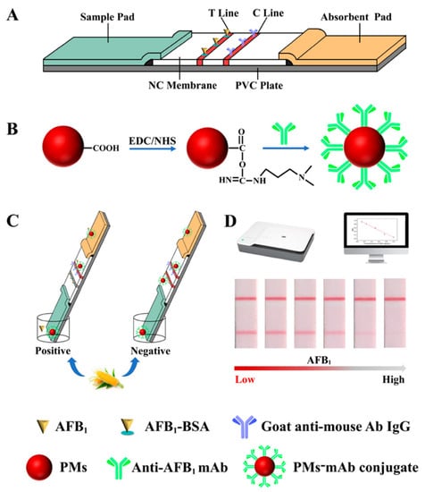 The scheme of the PMs-ICA. (A) The structure of the test strips, including a sample pad, a NC membrane, an absorbent pad, a PVC plate, and the AFB1-BSA, and goat anti-mouse antibody IgG were coated on the NC membrane form the T line and C line, respectively. (B) The process of labeling of mAbs with PMs. (C) Qualitative detection of the PMs-ICA. (D) Quantitative detection of the PMs-ICA.