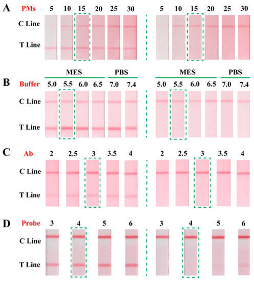 The amounts of mAb directly affect the sensitivity of the immunoassay []; 2, 2.5, 3, 3.5, 4 µL of mAb were selected to couple with PMs, respectively, and the sensitivity was tested. For the negative control groups, the color intensity of the T line gradually increased as the amount of mAb increased, but the color intensity was (basically) stable when the amount of antibody was added, 3 µL, which should be due to the limited carboxyl groups on the surface of the PMs (Figure 2C). For the positive test groups, all T lines were colorless. To obtain the best result with the least amount of mAb, 3 µL of mAb was decide for the next optimization experiments.
