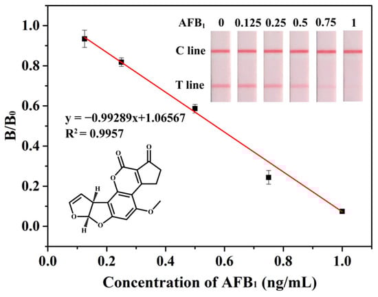 A series of concentrations of AFB1, including 0, 0.125, 0.25, 0.5. 0.75, 1 ng/mL were prepared, the sensitivity of PMs-ICA was evaluated under optimal condition, and each concentration of AFB1 was detected by three parallel experiments. For qualitative detection, the cut-off value was defined as the concentration of AFB1, resulting in no red bands on the T line judged by the naked eye []. For quantitative detection, the digital images scanned with a scanner were analyzed by TotalLab TL120 software. B/B0 was calculated and the calibration curve fitted by OriginPro 9.1 software (OriginLab Corp., Northampton, MA, USA) was obtained by plotting B/B0 against the concentration of AFB1. B and B0 denoted the color intensity of the T line in the positive control group and the test negative group, respectively. The qLOD was defined as the concentration giving 80% B/B0 from the calibration curve [,]. For the sensitivity of PMs-ICA in maize samples, the negative maize samples were brought from the local market and spiked. The sensitivity was evaluated under optimal conditions, with AFB1 at concentrations of 0, 0.75, 1.5, 3, 4.5, 6 µg/kg.