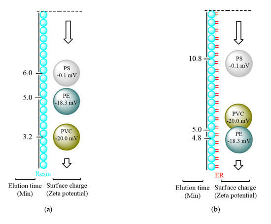 Liquid chromatography was used to verify the binding of micro-plastics to ERs following the detection conditions of SPR. According to the surface charge characteristics, the elution time for different micro-plastics staying in resins was different (Figure 3a), and when the ERs were immobilized, the separation effect was enhanced (Figure 3b). PS, with the largest surface charge, stayed in resins for the longest time; on the other hand, PVC stayed in resins for the shortest time because of the smallest surface charge [29,30]. However, regardless of whether the surface charge was high or low, we could not clearly distinguish the five particles of micro-plastics during the detection period. Once the ERs were immobilized on Ni-NTA, it was found that PE did not extend the elution time due to ERs’ effects. However, in the same situation, the elution time of PVC was extended by about 1.8 min, and that of PS was increased by nearly 5 min compared to resins. Therefore, we inferred that the surface charge influence on micro-plastics is a major factor, and the ERs played a supporting role, making the effect of surface charge an additive effect (Figure 3c–h). Due to the small surface charge between PE and PVC, the identified effects were not enhanced even with ERs supplemented.