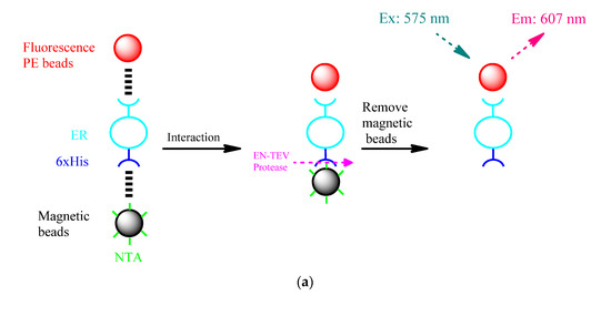 A model similar to ELISA was used to further verify the specific effect of micro-plastics on ER. As shown in Figure 7a, ERs were specifically bound on magnetic beads’ surface, which is similar in size to micro-plastics (~30 μm); then, the ERs were interacted with PE-fluorescence micro-plastics. In order to eliminate the shielding effect from the magnetic beads, the EN-TEV protease recognized and cleaved at Gly/Ser in Glu-Asn-Leu-Tyr-Phe-Gln-(Gly/Ser) sequence on 6xHis after the PE-fluorescence micro-plastics’ finished reacting with the ERs. ER–PE-micro-plastics complexes were observed by detecting the fluorescence from PE beads at 607 nm. In the control group experiment with only fluorescent PE micro-plastics (without ERs), fluorescence value is close to the background value, as shown in Figure 7b, the fluorescence value of ERs-PE micro-plastics complex also followed Langmuir equation. The KD and kd calculated as 3.51 and 0.28 nM, respectively (Figure 7c, Table 1), which verified the specific interaction between micro-plastics and ERs, further. In addition, the methodology between SPR and ELISA was compared found that the ER had lower binding level on ELISA mode at the same ERs immobilization concentration which means the surface area of spherical magnetic beads for immobilizing ERs was smaller than the SPR’s. On the other hand, as the ELISA-magnetic bead mode was static that was easier to “intercept” PE micro-plastics and resulting a larger kd value.